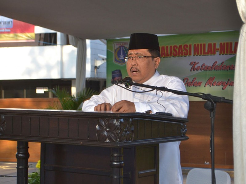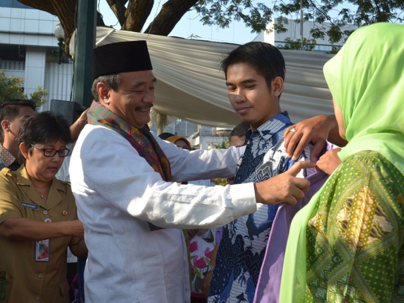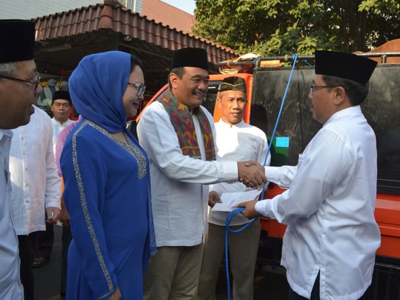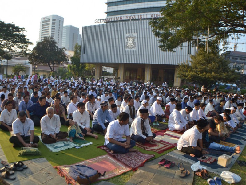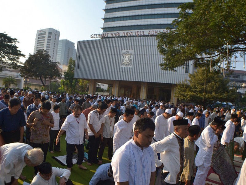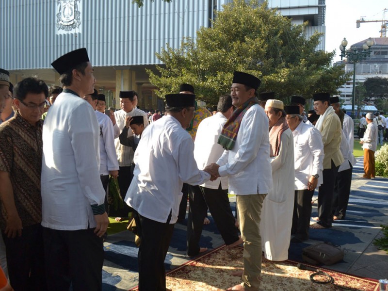 Wakil Gubernur DKI Jakarta Djarot Saiful Hidayat, menunaikan Shalat Idul Adha bersama pejabat dan PNS DKI serta warga sekitar di Balai Kota di Jalan Medan Merdeka Selatan, Gambir Jakarta Pusat. Kamis (24/9/2015). Usai Shalat Ied, Djarot menyerahkan satu ekor sapi dan empat ekor kambing kepada panitia kurban, serta melepas secara resmi 15 orang petugas kesehatan pemeriksa hewan kurban. (Foto: Yopie/beritajakarta.com)