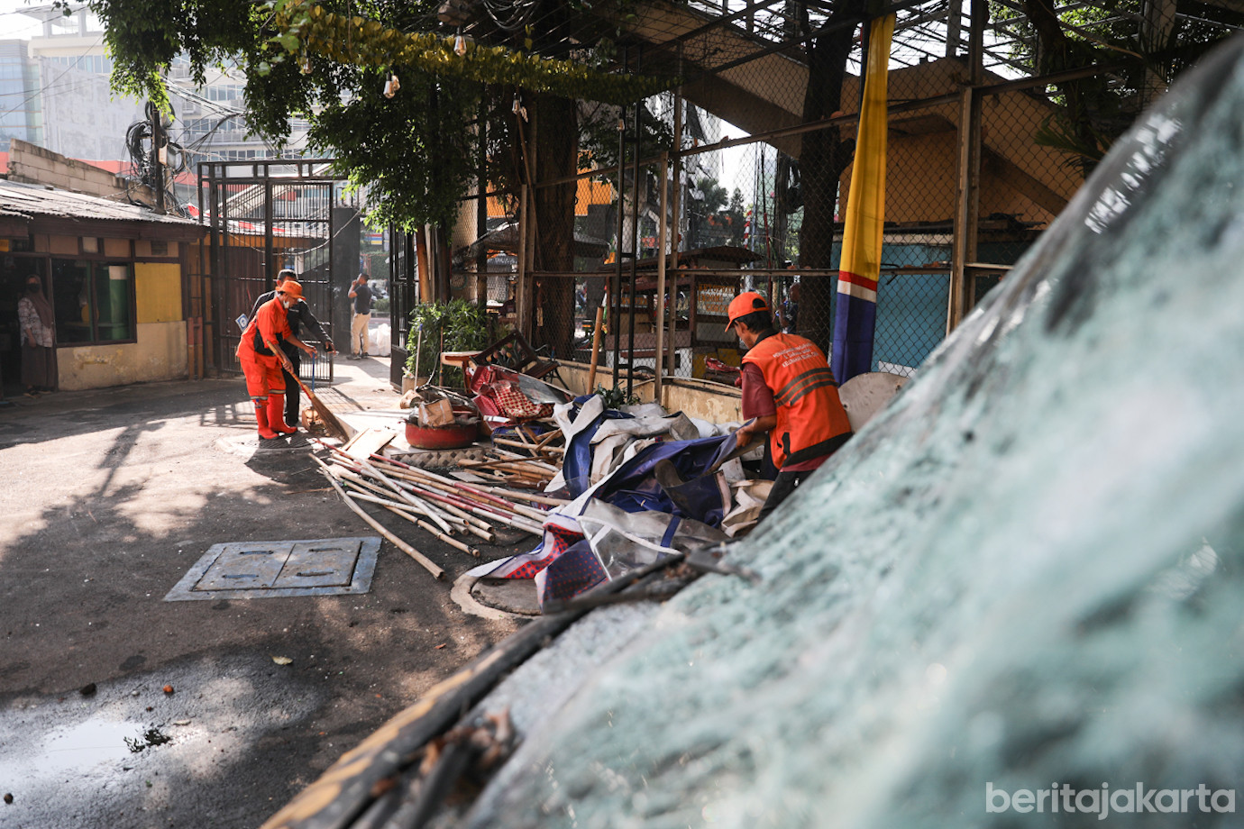 Petugas Penanganan Prasarana dan Sarana Umum (PPSU) Bidara Cina membersihkan puing-puing di Polsek Jatinegara, Jakarta Timur, Sabtu (30/8). Polsek Jatinegara menjadi salah satu lokasi yang menjadi sasaran amuk masa yang tersebar ke sejumlah wilayah di Jakarta.