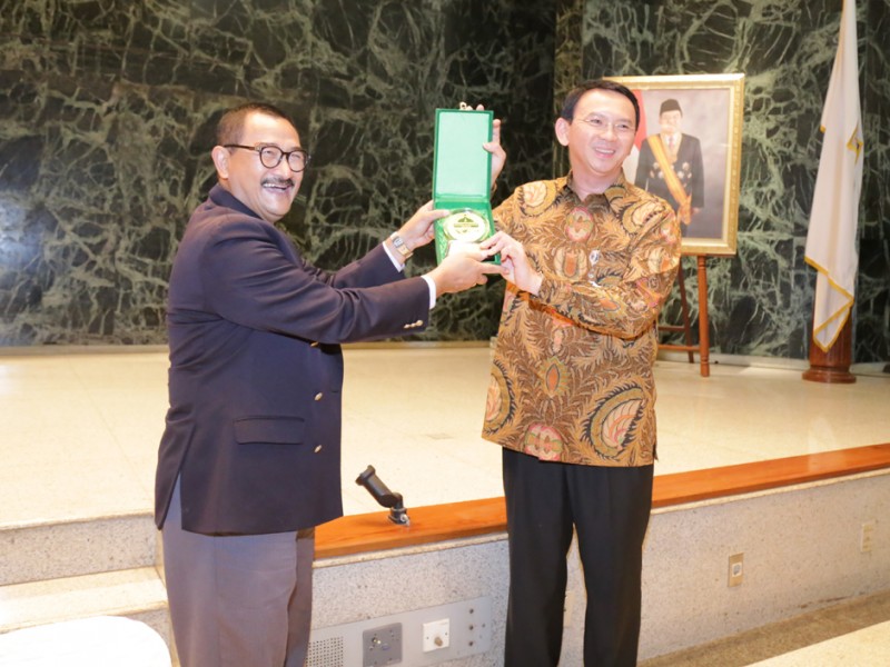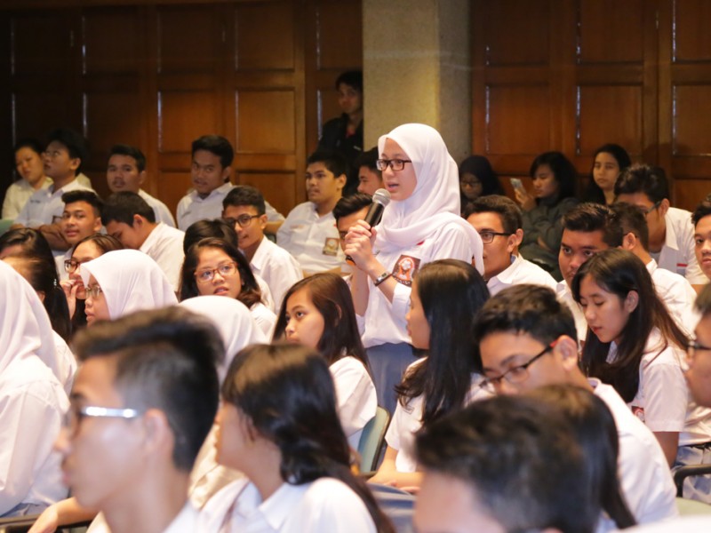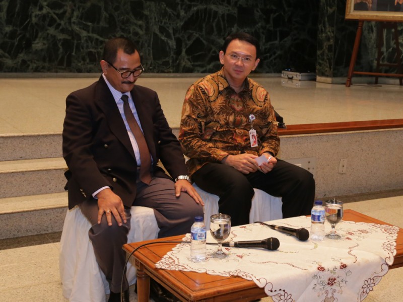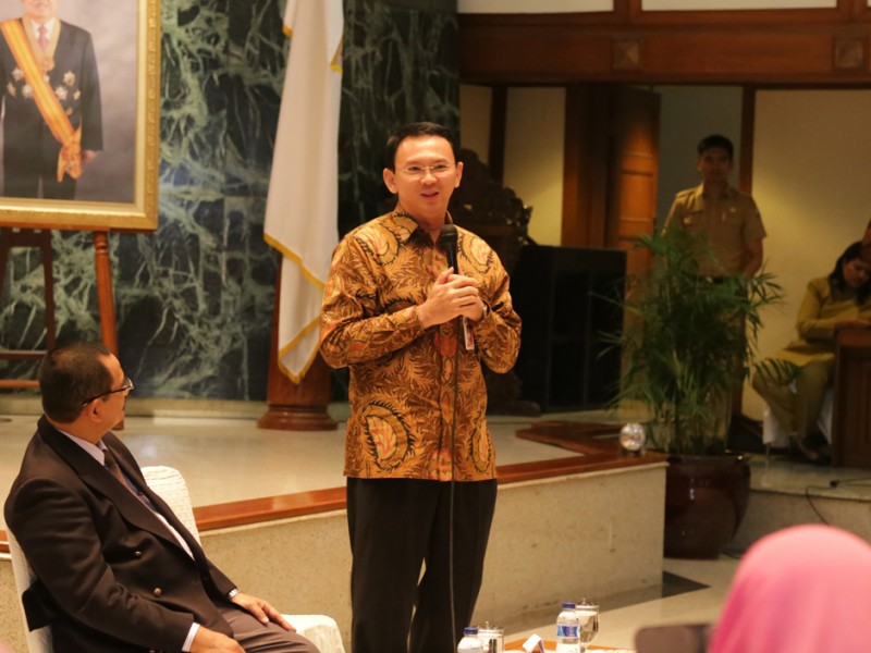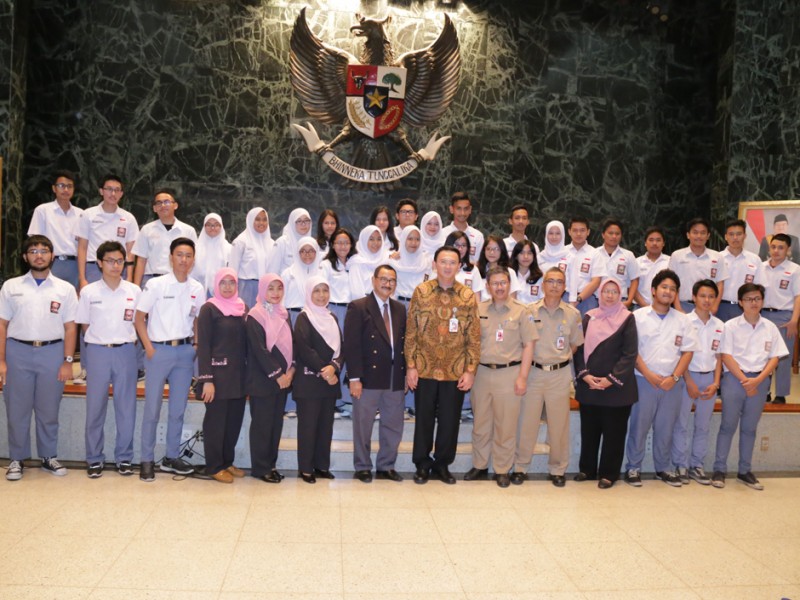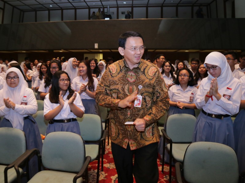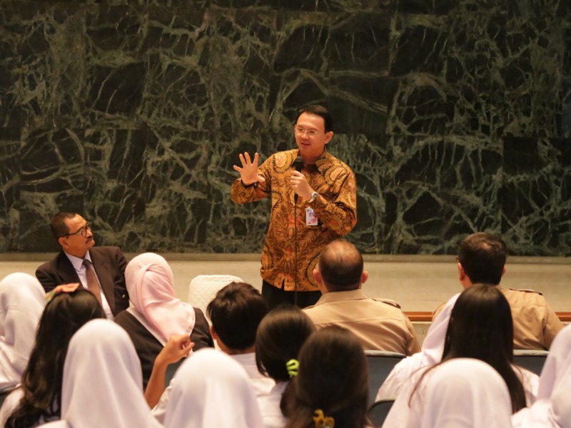 Gubernur DKI Jakarta, Basuki Tjahaja Purnama menerima kunjungan pelajar dari SMA Yayasan Al-Hidayah di Balai Kota DKI Jakarta, Selasa (29/9/2015). Dalam kesempatan tersebut, para pelajar bisa bertanya dan mendengar jawaban langsung kepada Basuki terkait kepemimpinannya yang tegas dan berani melawan korupsi. (Foto: Reza/beritajakarta.com)