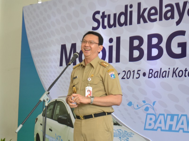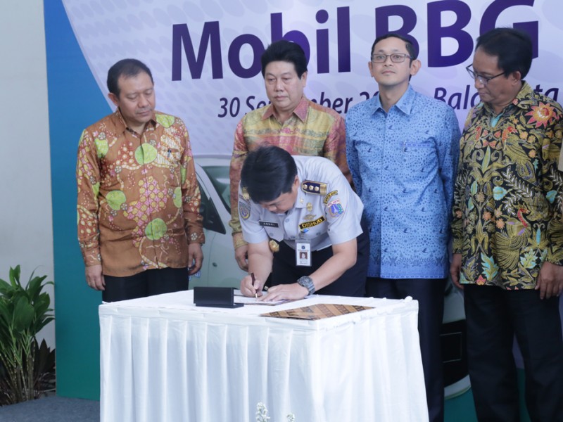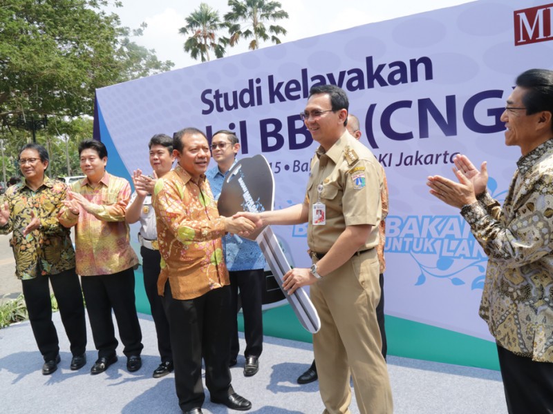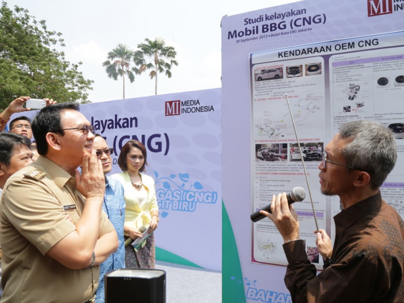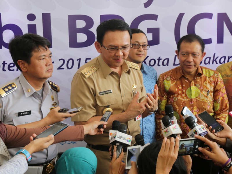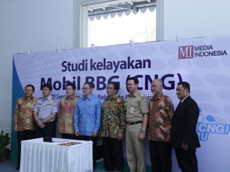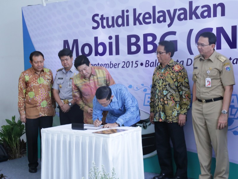 Gubernur DKI Jakarta, Basuki Tjahaja Purnama menyaksikan penandatanganan Memorandum of Understanding (MoU) Mobil Prototype CNG dalam rangka studi kelayakan CNG di Balai Kota DKI Jakarta, Rabu (30/9/2015). Kerjasama melibatkan Pemerintah Provinsi (Pemprov) DKI Jakarta, Dewan Energi Nasional, PT. Blue Bird dan PT. Express. (Foto: Reza/beritajakarta.com)