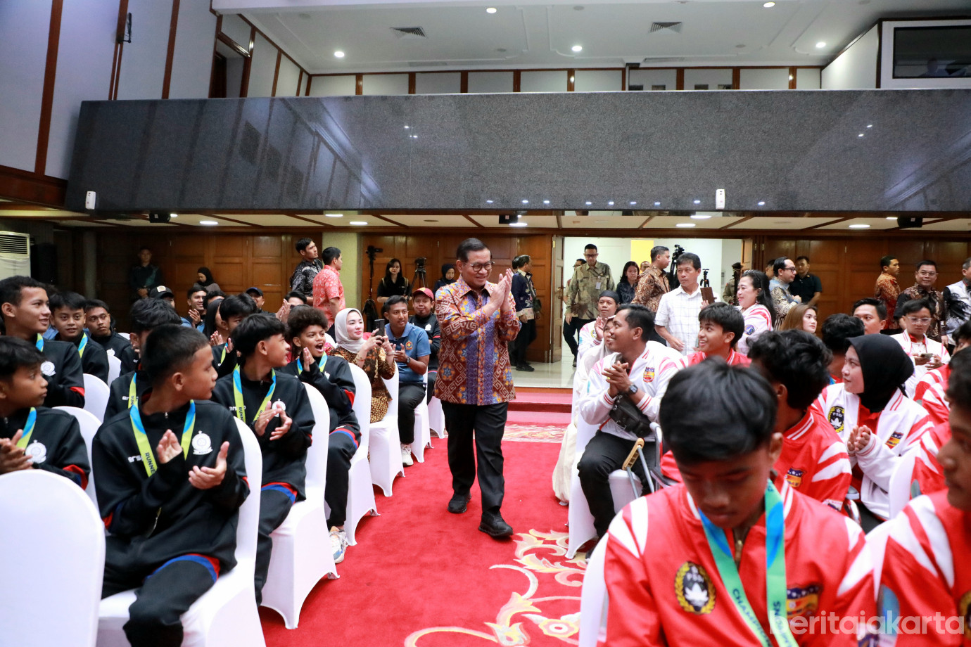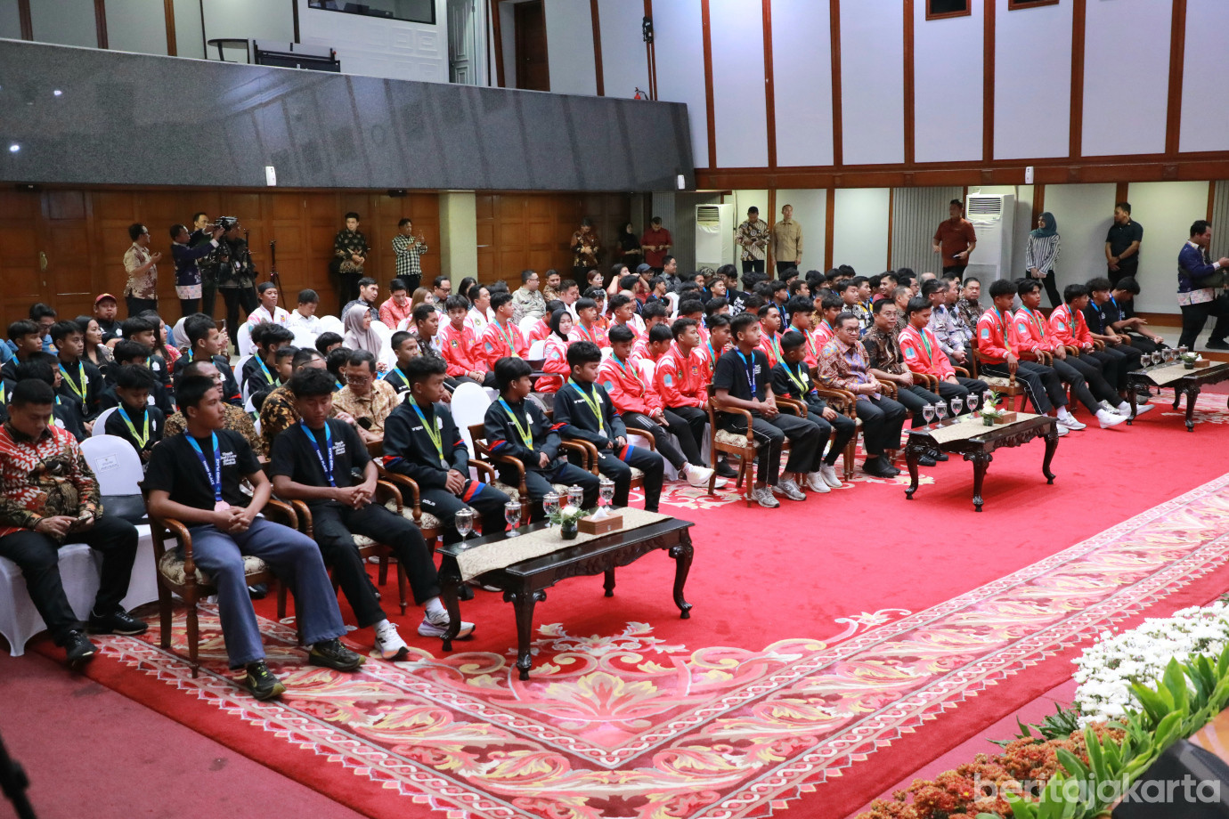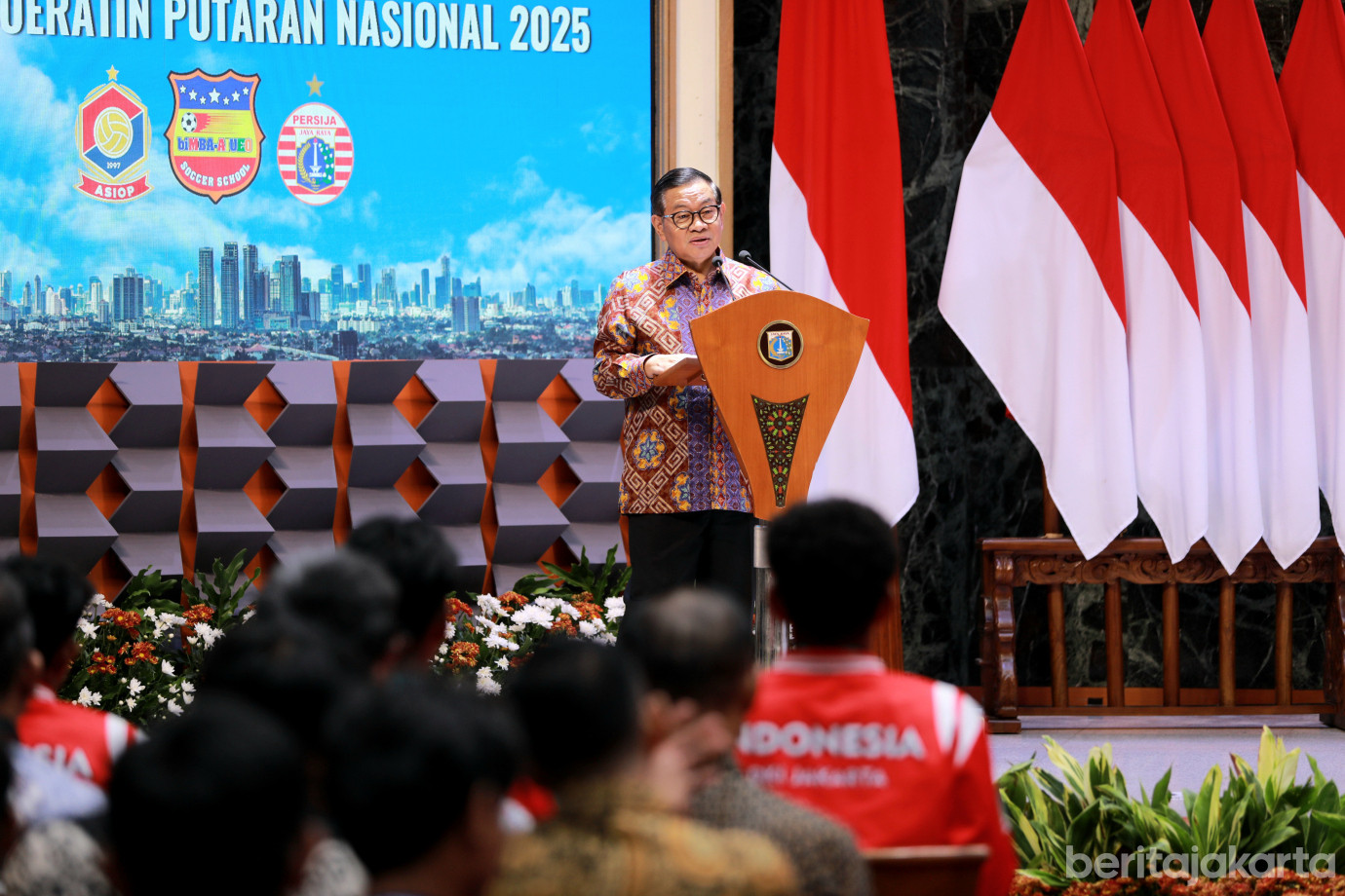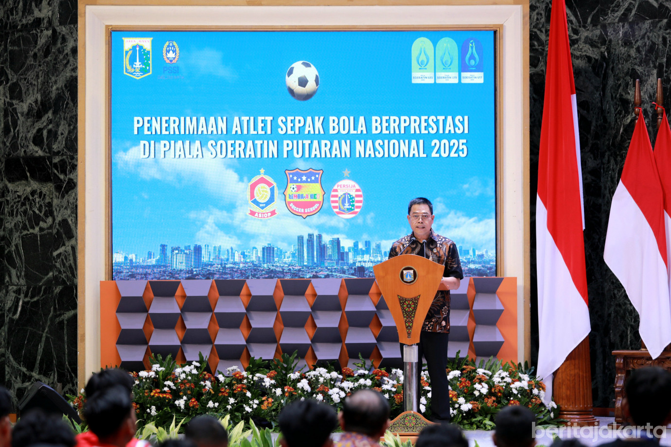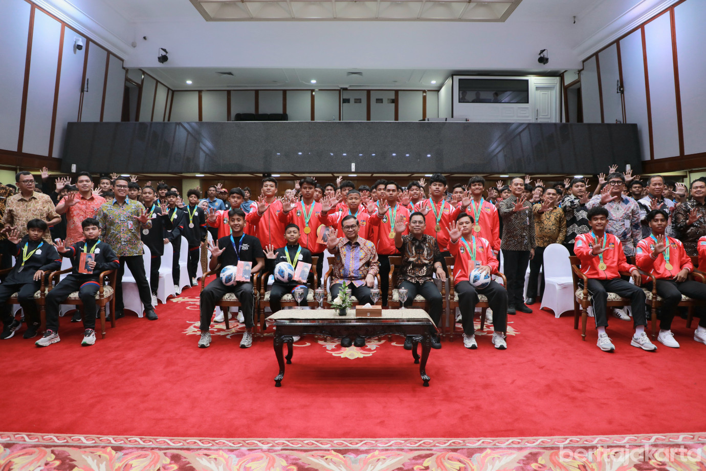 Gubernur DKI Jakarta, Pramono Anung memberikan apresiasi kepada para pemain sepak bola berprestasi dari kelompok umur U13, U15 dan U17 pada kejuaraan Piala Soeratin Nasional 2025 di Balai Agung, Balai Kota DKI Jakarta, Kamis (2/10). Dalam sambutannya Pramono berharap masa depan persepakbolaan Jakarta akan semakin cerah dengan lahirnya talenta-talenta baru serta dapat melanjutkan kiprahnya menjadi atlet sepak bola profesional.