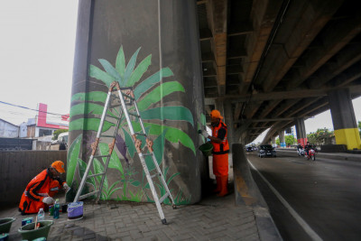 Petugas Penanganan Prasarana dan Sarana Umum (PPSU) Kelurahan Lagoa mempercantik tiang Tol Cilincing dengan mural bertema keindahan alam di Jalan Raya Cilincing, Lagoa, Koja, Jakarta Utara, Senin (24/11). Pembuatan mural ini merupakan upaya Kelurahan Lagoa untuk menata area bawah tol agar terlihat lebih rapi, bersih dan estetik, sekaligus menghilangkan kesan kumuh.