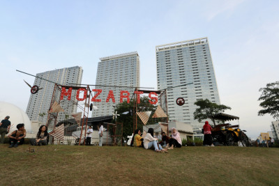 Sejumlah pengunjung melihat karya dalam Pameran Seni Rupa Motorsaikel Kalcer: Gas Aja Dulu yang digelar di Rooftop Garden Plaza Taman Ismail Marzuki (TIM), Jalan Cikini Raya, Menteng, Jakarta Pusat. Pameran yang berlangsung dari 17–30 November 2025 ini diinisiasi oleh komunitas Mozart 73, menghadirkan karya bertema sepeda motor dari 17 seniman alumni Institut Kesenian Jakarta (IKJ) dengan menginterpretasi hubungan sepeda motor dengan kehidupan masyarakat urban Jakarta, melalui medium patung, instalasi, dan mix media, para perupa.