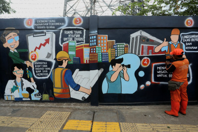 Kecamatan Tanjung Priok mempercantik Jalan Yos Sudarso dengan mural edukatif yang dikerjakan oleh perwakilan PPSU setiap kelurahan di Kecamatan Tanjung Priok, Kamis (27/11). Proses pembuatan mural ini dilakukan untuk membuat lingkungan lebih menarik sekaligus menyampaikan pesan edukatif kepada warga yang melintas.