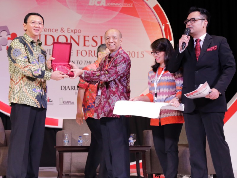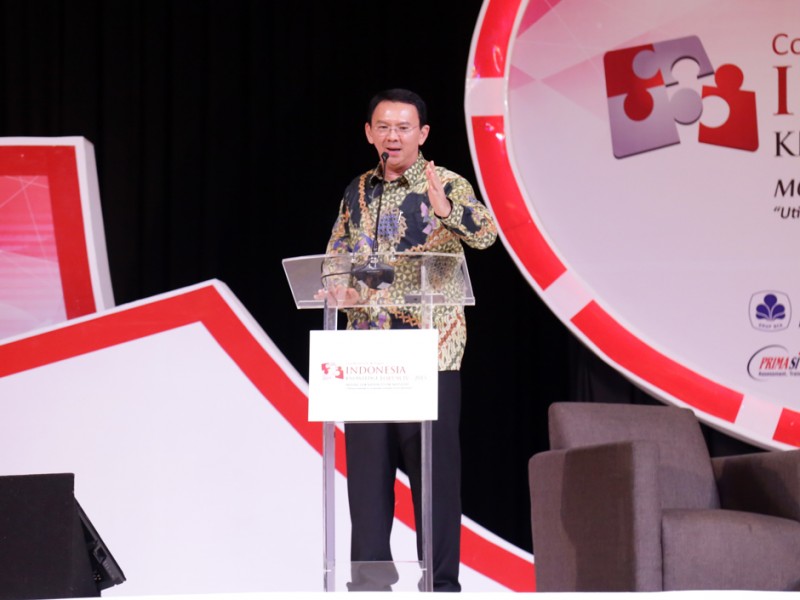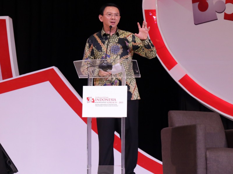 Gubernur DKI Jakarta, Basuki Tjahaja Purnama menjadi pembicara dalam acara Indonesia Knowledge Forum Tahun 2015 Conference and Expo–BCA Learning Service (BLS) di salah satu hotel di kawasan Jakarta Selatan, Kamis (9/10/2015). Dalam kesempatan tersebut Basuki meminta mereka yang hadir dalam acara ini berani membuat terobosan-terobosan baru. (Foto : Reza/Beritajakarta.com)
