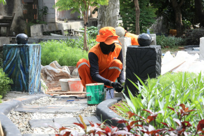 Petugas Penanganan Prasarana dan Sarana Umum (PPSU) Kelurahan Pondok Kopi menyulap lahan tidak terpakai di Jalan Arabika, Pondok Kopi, Duren Sawit, menjadi kawasan unggulan triwulan IV tahun 2025, Senin (8/12). Taman ini dilengkapi fasilitas seperti tempat duduk, jalur pejalan kaki, jalur refleksi, serta dipercantik dengan tanaman hias, diantaranya gandarusa aurelia, cemara air dll.