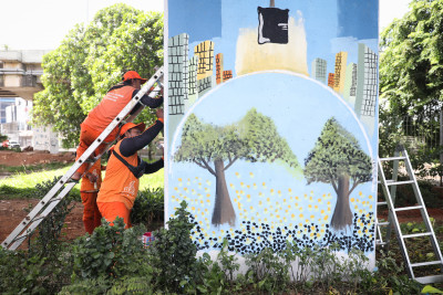 Petugas Penanganan Prasarana dan Sarana Umum (PPSU) dari berbagai wilayah melukis mural di tiang Tol Becakayu dan Tol Dalam Kota, Jalan Laksamana Malahayati, Jakarta Timur, Selasa (16/12). Sebanyak 812 tiang yang melintasi jalan raya sepanjang 18 kilometer dipercantik dengan mural yang dilukis oleh petugas PPSU dari 65 Kelurahan yang ada di Jakarta Timur.