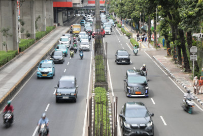 Sejumlah kendaraan melintas dekat tiang monorel yang terbengkalai di Jalan HR Rasuna Said, Kuningan, Jakarta Selatan, Kamis (8/1). Gubernur DKI Jakarta, Pramono Anung memastikan proyek pembongkaran tiang-tiang monorel terbengkalai yang berdiri di sepanjang Jalan HR Rasuna Said segera dilaksanakan pada minggu ketiga bulan ini yakni pada Rabu pekan depan.