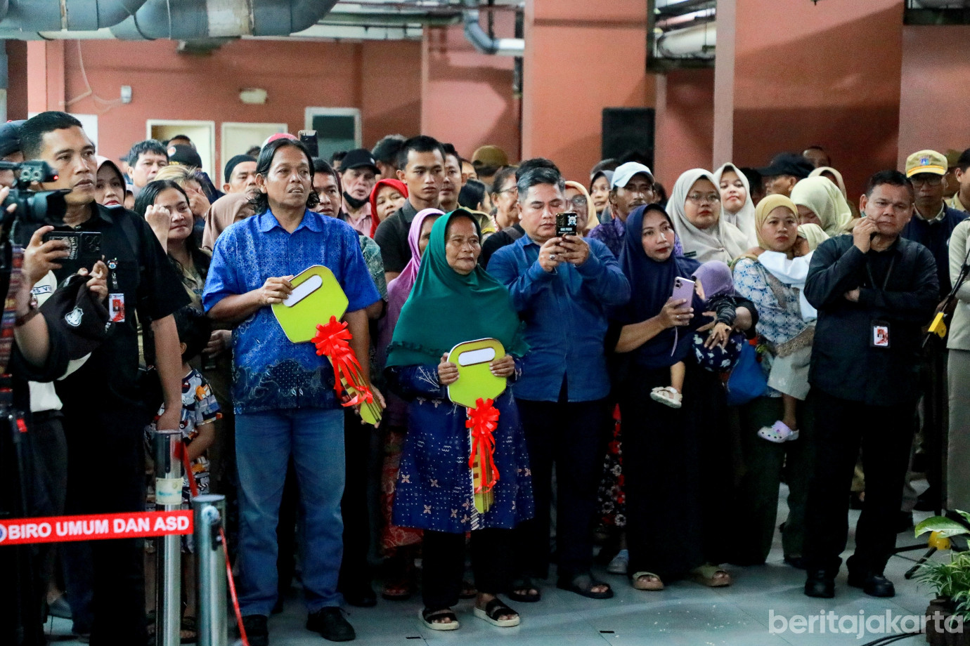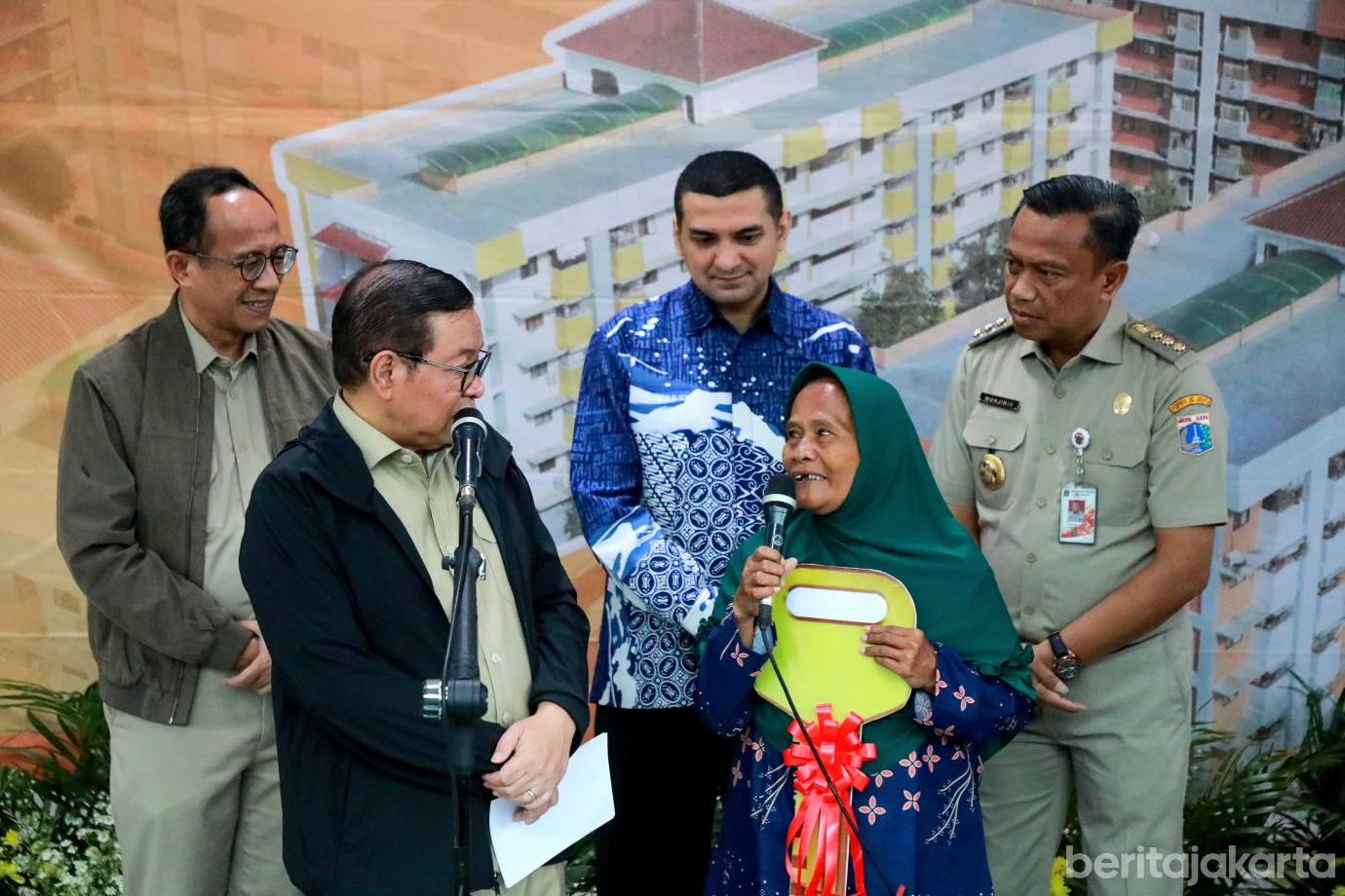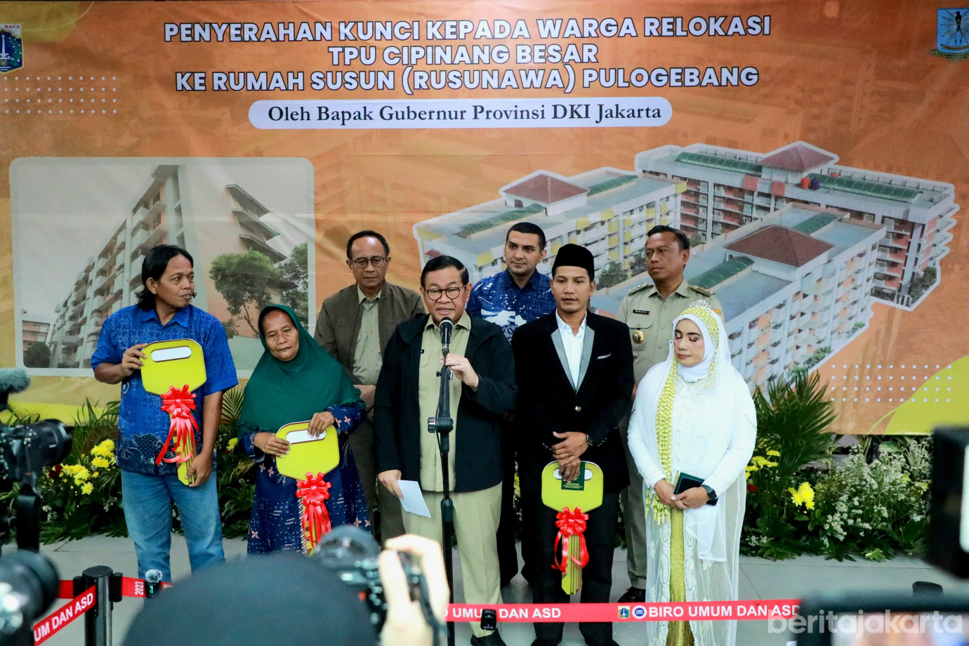 Gubernur DKI Jakarta, Pramono Anung menyerahkan kunci kepada 73 Kepala Keluarga (KK) yang direlokasi dari Tempat Pemakaman Umum (TPU) Kebon Nanas ke Rusunawa Pulogebang, Cakung, Jakarta Timur, Senin (12/1). Penyerahan ini merupakan upaya Pemerintah Provinsi (Pemprov) DKI dalam memberikan hunian yang lebih layak kepada warganya sekaligus mempercepat pengembalian fungsi lahan tempat pemakaman umum guna menambah ketersediaan lahan pemakaman di Jakarta.
