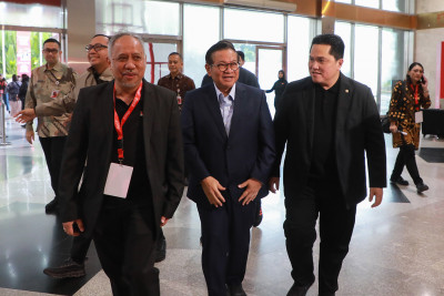 Pramono Anung selaku Gubernur DKI Jakarta bersama dengan Menteri Pemuda dan Olahraga RI, Erick Thohir menghadiri penyambutan FIFA World Cup 26 Trophy Tour di Hall A, Jakarta International Convention Center, Gelora, Tanah Abang, Jakarta Pusat, Kamis (22/1). FIFA World Cup 26 Trophy akan menjalani tur dunia dan dapat disaksikan secara langsung oleh warga Jakarta pada hari ini hingga pukul 22.00.