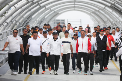 Gubernur DKI Jakarta, Pramono Anung menyaksikan penandatanganan kerja sama sekaligus melakukan groundbreaking pembangunan ekstensi jembatan penyeberangan orang Jakarta International Stadium (JPO JIS) dan kawasan Ancol di Jalan Ketel Uap, Pademangan, Jakarta Utara, Minggu (25/1). Eksentensi jembatan yang bernama JPO Bersama BTN tersebut meliputi jembatan sepanjang 166 meter dan jalur pedestrian sepanjang 300 meter yang menghubungkan JIS dengan kawasan Ancol.