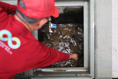 Pengurus RT 08 RW 4 melakukan perawatan dan pemeliharaan rutin pada tanaman dan ikan di Gang 8 Nusa Indah IV, Kelurahan Malaka Jaya, Duren Sawit, Jakarta Timur, Senin (26/1). Inovasi gang percontohan yang sudah berjalan selama dua tahun ini meliputi kolam gizi, tanaman obat keluarga, komposter komunal, budidaya maggot, hingga budidaya lele di dalam saluran beton u-ditch.