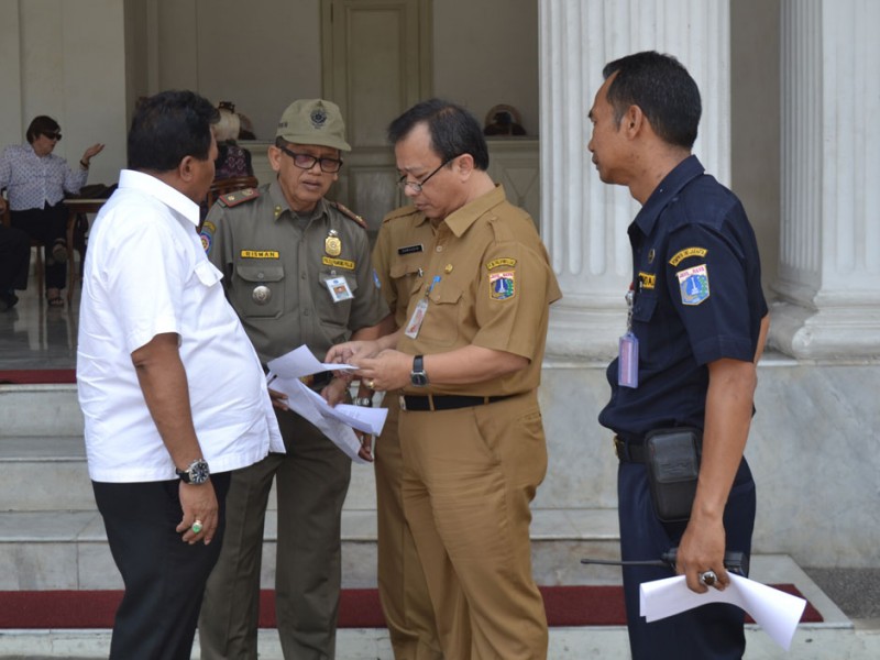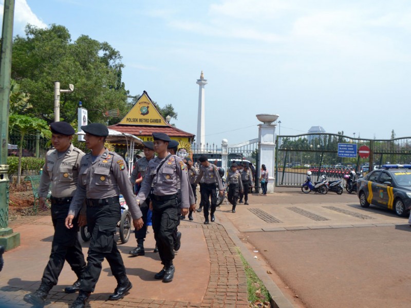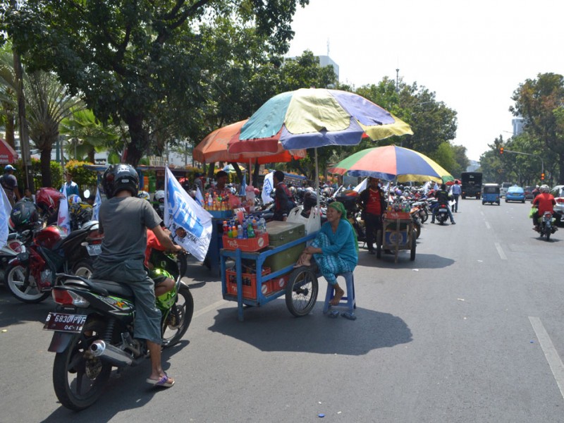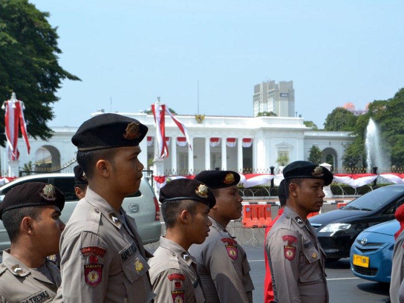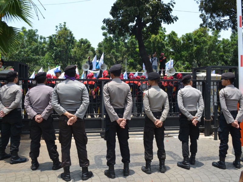 Menyambut setahun kepemimpinan Presiden Joko Widodo-Jusuf Kalla Serikat Buruh dan Mahasiswa se-DKI Jakarta menggelar unjuk rasa di Istana Merdeka Jalan Medan Merdeka Utara, Gambir Jakarta Pusat dan Balai kota DKI Jakarta, Jalan Medan Merdeka Selatan, Gambir Jakarta Pusat, Selasa (20/10/2015). Aksi ratusan masa buruh dan mahasiswa ini berjalan kondusif dengan pengawalan ketat petugas keamanan.(Foto: Yopie / Beritajakarta.com)