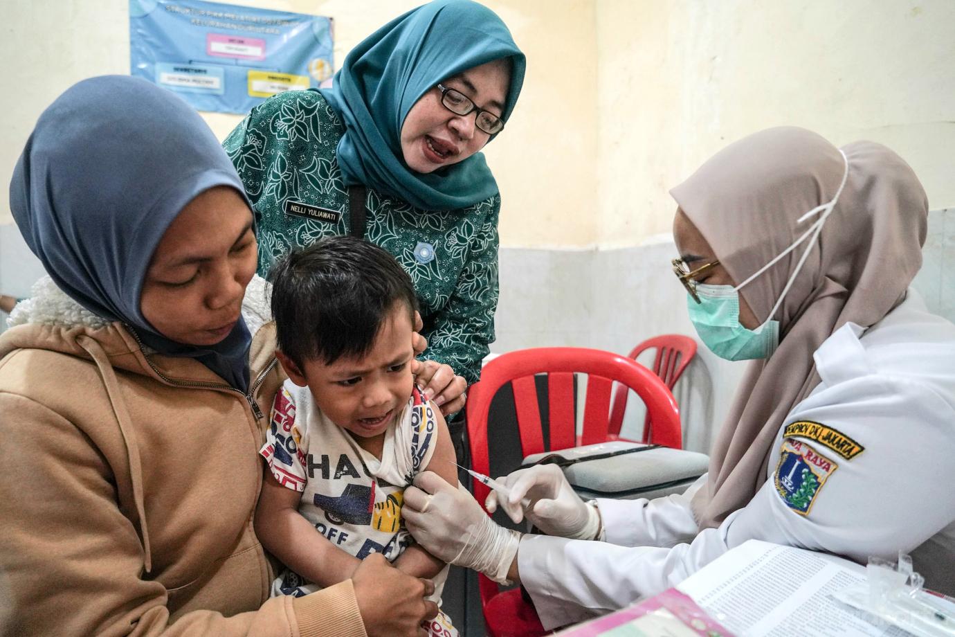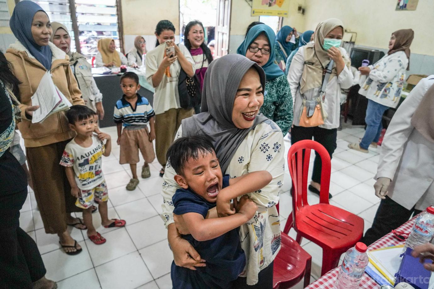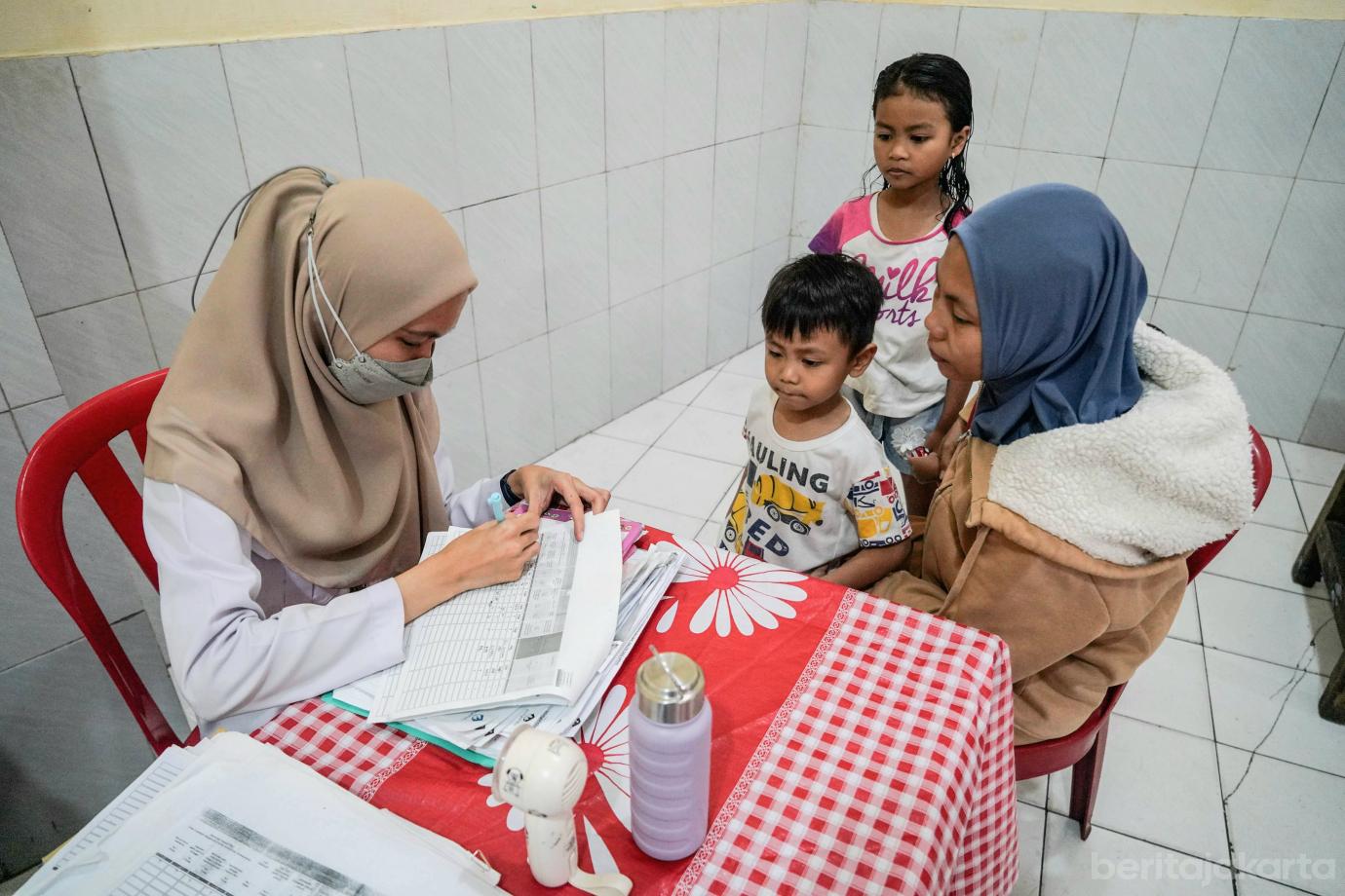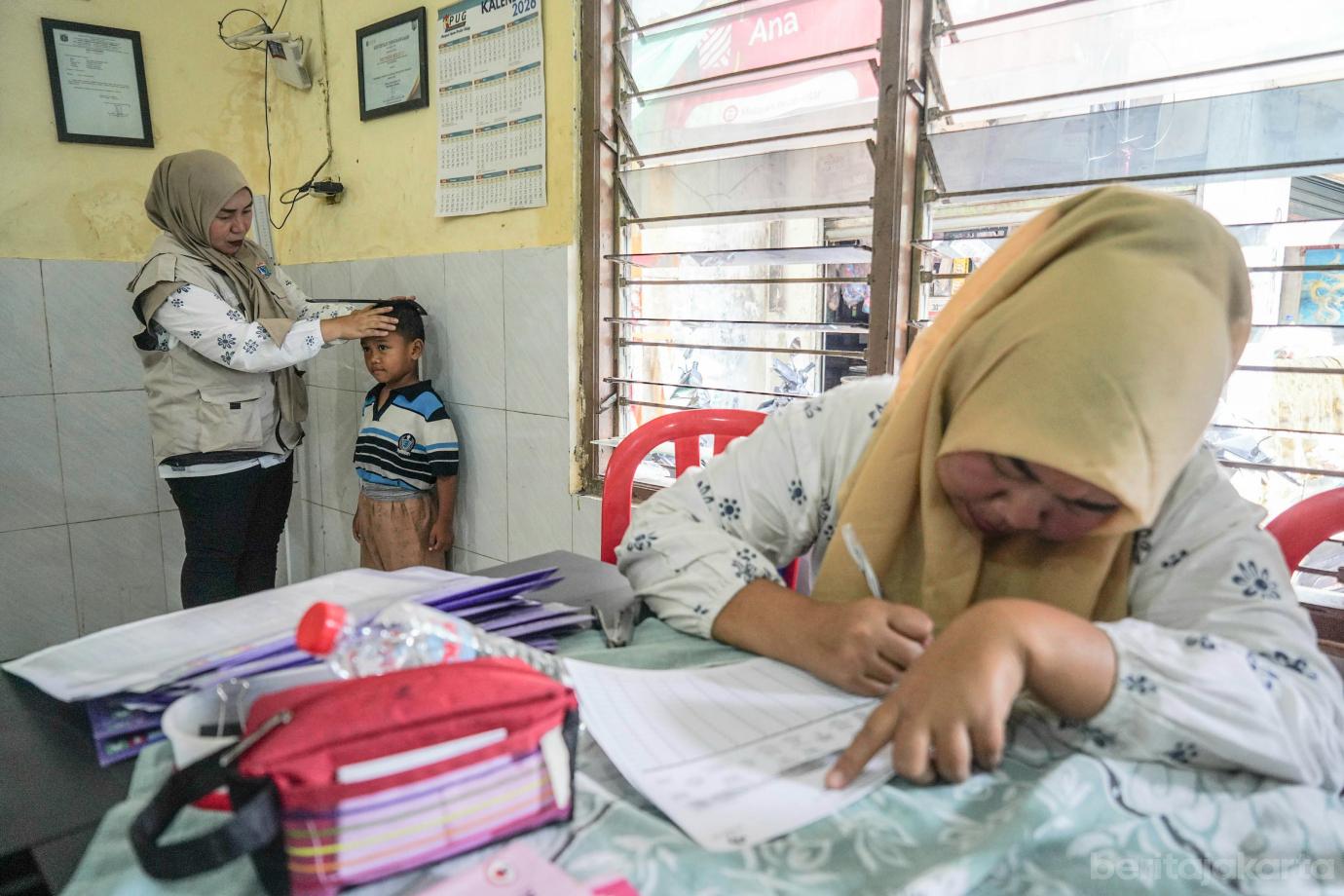Sebanyak 32 Balita mengikuti pemeriksaan kesehatan rutin di Pos Pelayanan Terpadu (Posyandu) di Balai Warga RW 1 Duri Utara, Tambora, Jakarta Barat, Rabu (8/4). Posyandu yang rutin digelar satu bulan sekali tersebut menyediakan layanan KIA (Kesehatan Ibu dan Anak), KB, pemantauan gizi (timbang & ukur), imunisasi, serta penyuluhan kesehatan gratis bagi warga sekitar.