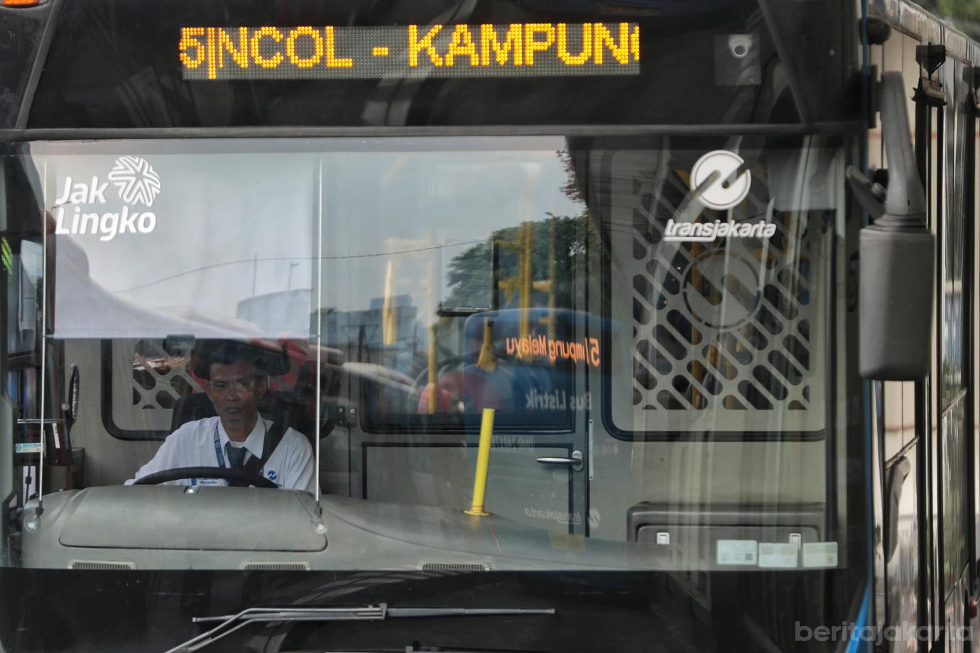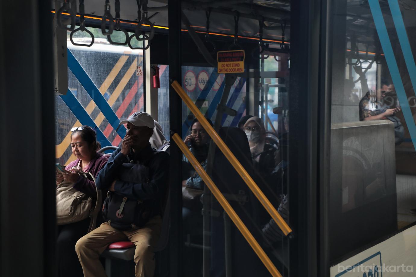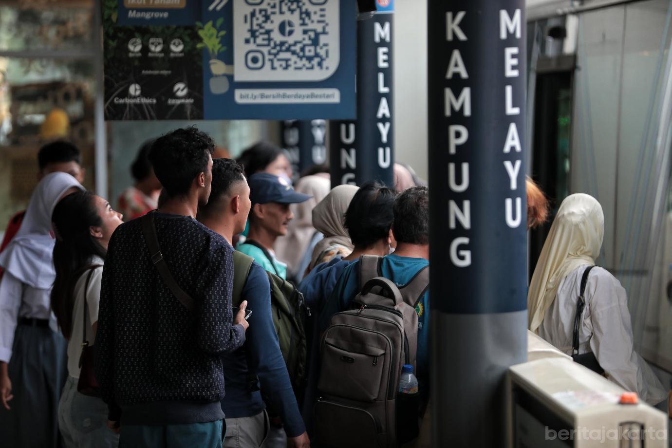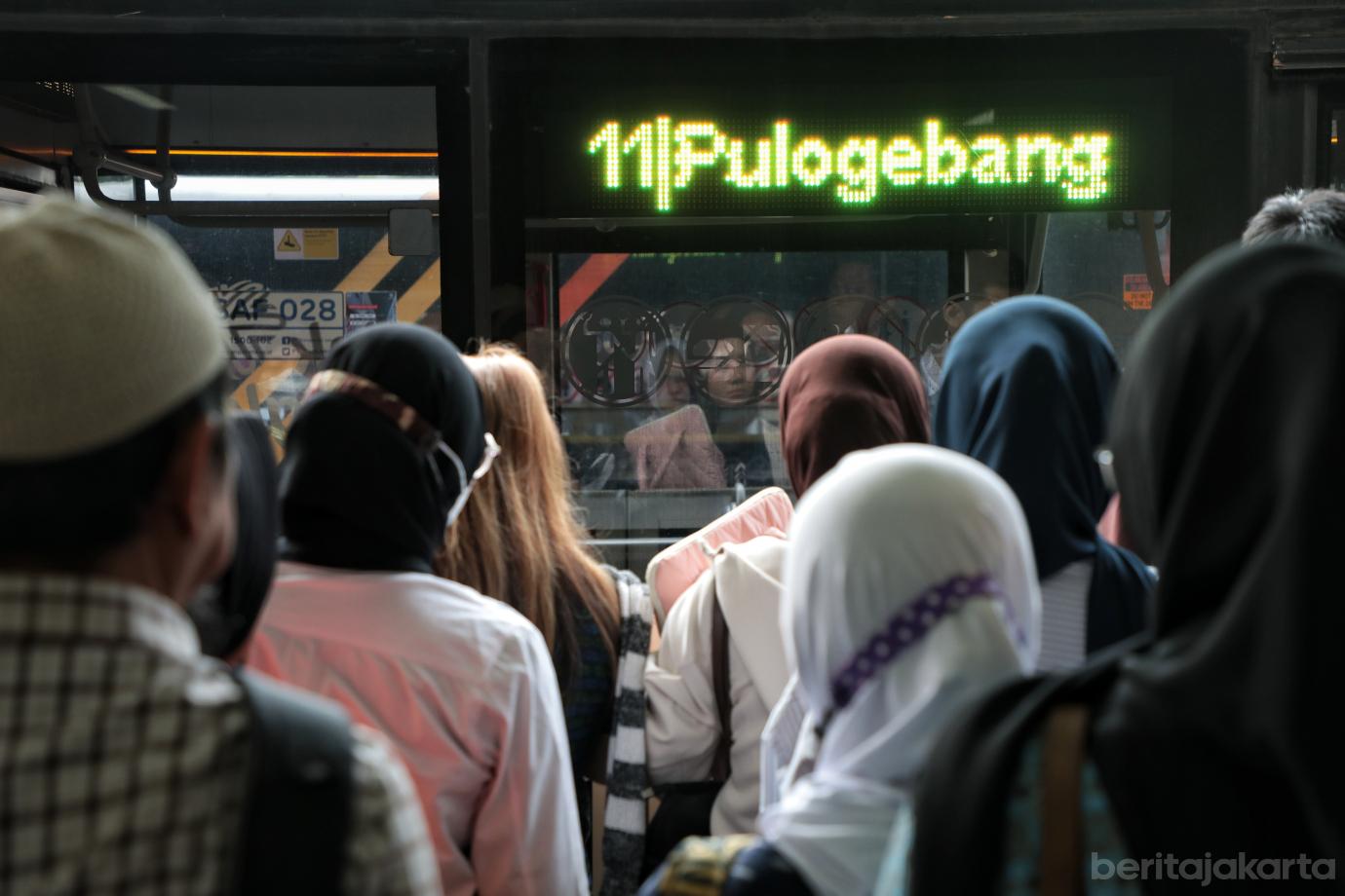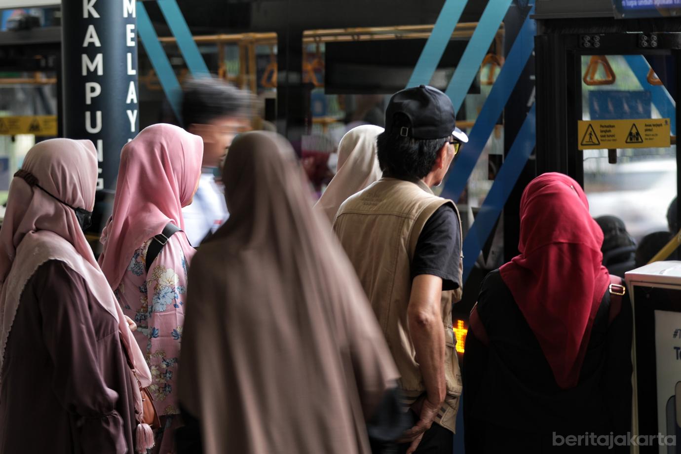 Sejumlah calon penumpang menunggu kedatangan bus Transjakarta di Halte Transjakarta Kampung Melayu, Jakarta Timur. Pemerintah Provinsi (Pemprov) DKI Jakarta akan memberlakukan tarif khusus Rp1 untuk layanan transportasi umum Transjakarta, MRT dan LRT Jakarta, pada Hari Transportasi Nasional yang diperingati setiap tanggal 24 April.