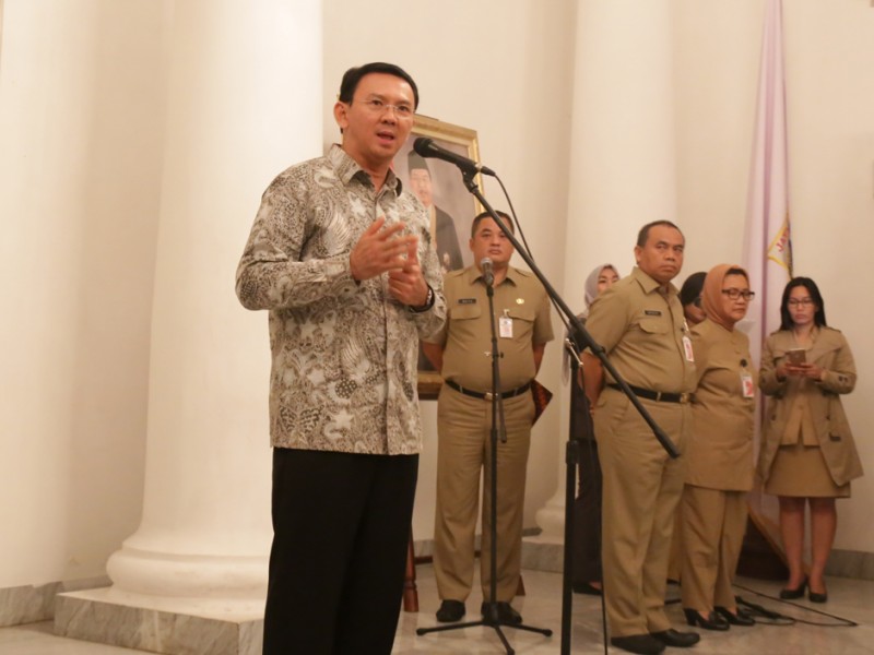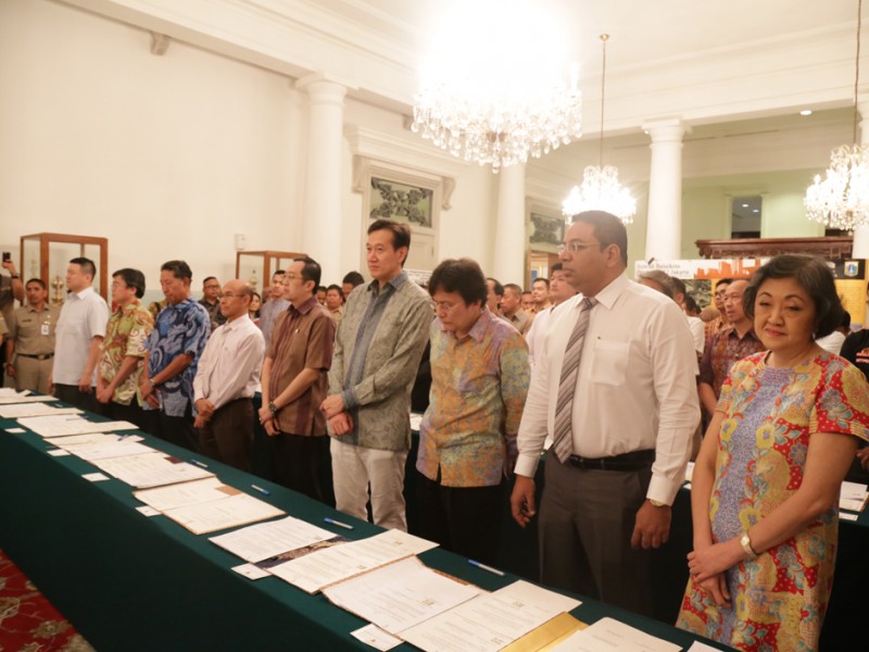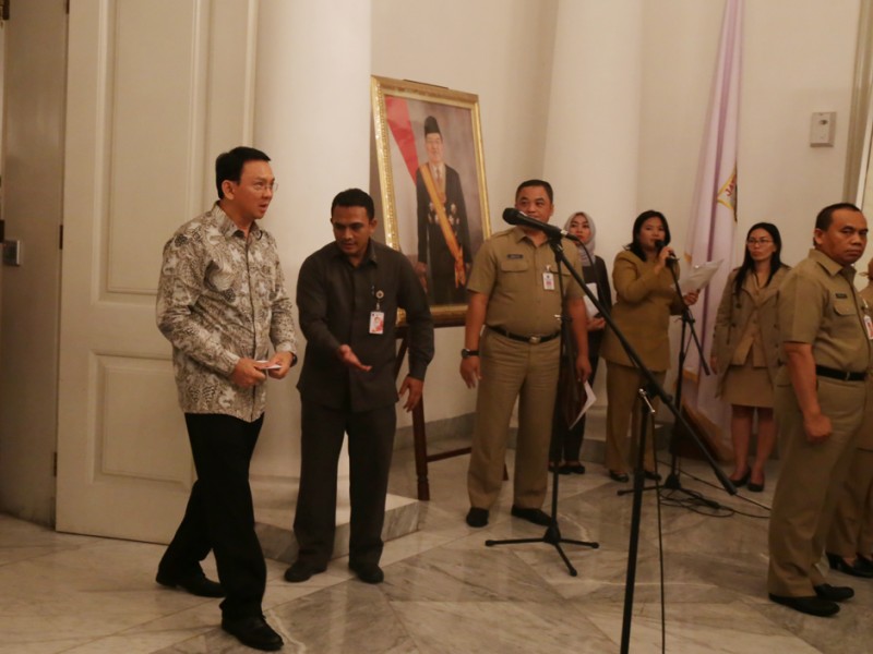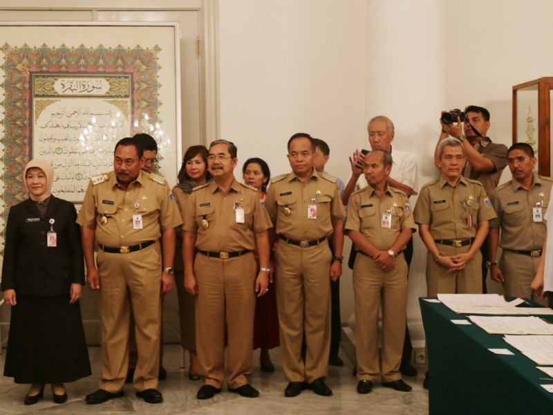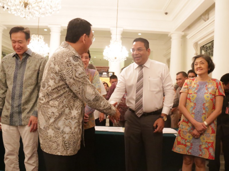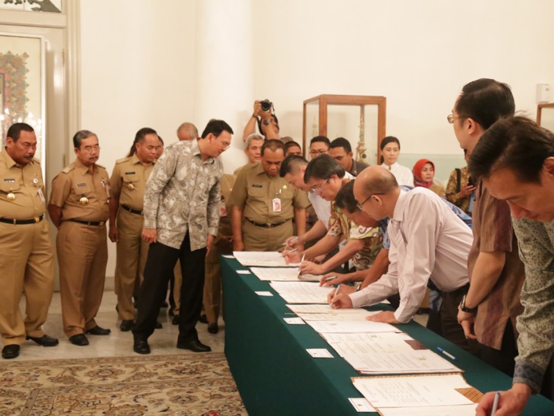 Gubernur DKI Jakarta, Basuki Tjahaja Purnama menyaksikan penandatanganan kesepakatan bersama dan perjanjian kerjasama Ruang Publik Terpadu Ramah Anak (RPTRA) tahap III antara Pemprov DKI Jakarta dengan para pimpinan perusahaan pemberi CSR di Balai Kota DKI Jakarta, Selasa (27/10/2015). Dalam sambutannya Basuki mengucapkan terima kasih kepada seluruh perusahaan yang membantu terwujudnya pembangunan RPTRA. (Foto: Reza/beritajakarta.com)