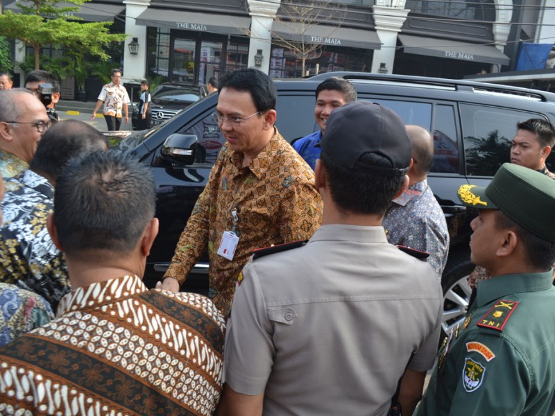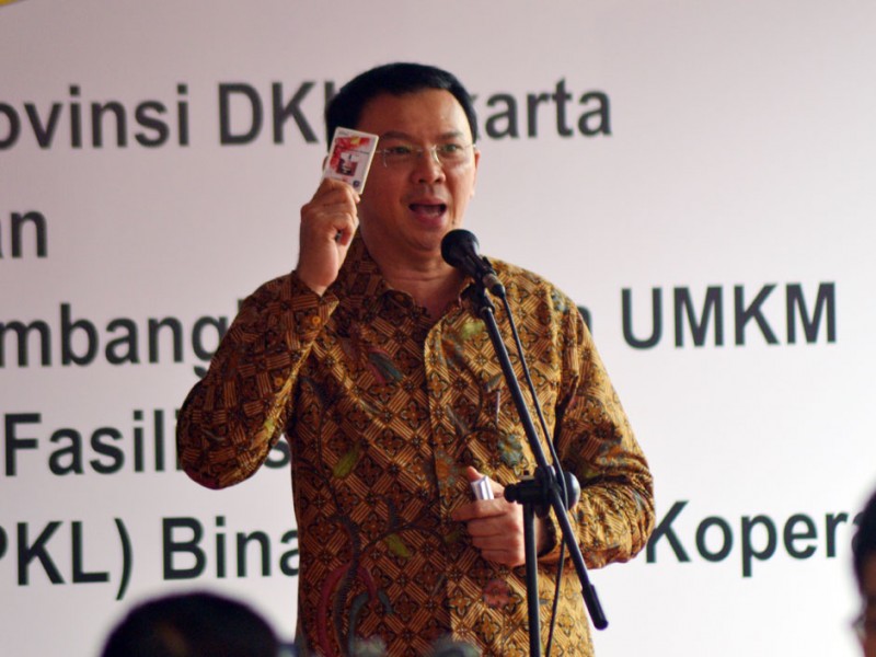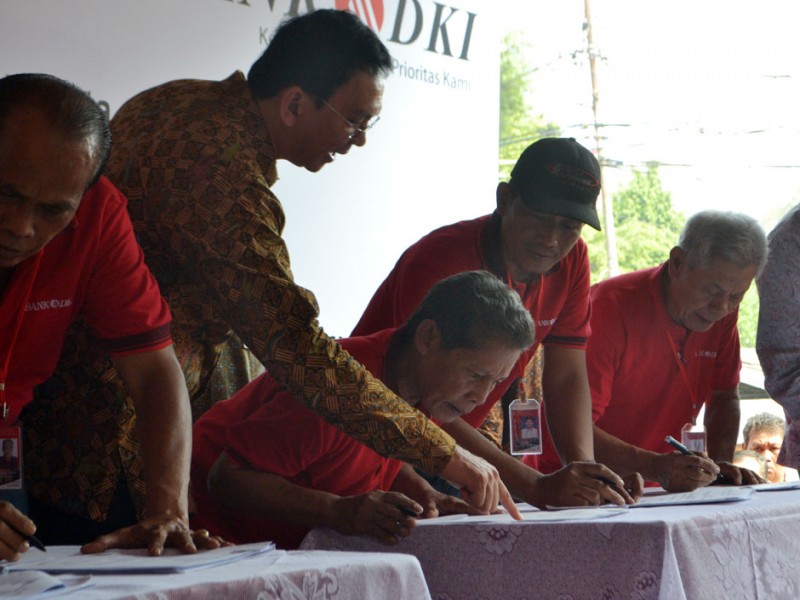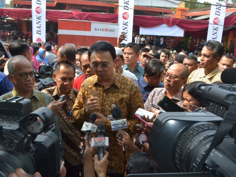 Gubernur DKI Jakarta, Basuki Tjahaja Purnama menyaksikan penandatanganan Perjanjian Kredit PKL dengan Bank DKI secara massal, di Pasar Taman Puring, Jalan Kyai Maja, Kebayoran Baru, Jakarta Selatan, Jumat (30/10/2015). Melalui kemudahan mendapatkan bantuan permodalan ini diharapkan para PKl bisa lebih mengembangkan usahanya.(Foto : Yopie/Beritajakarta.com)