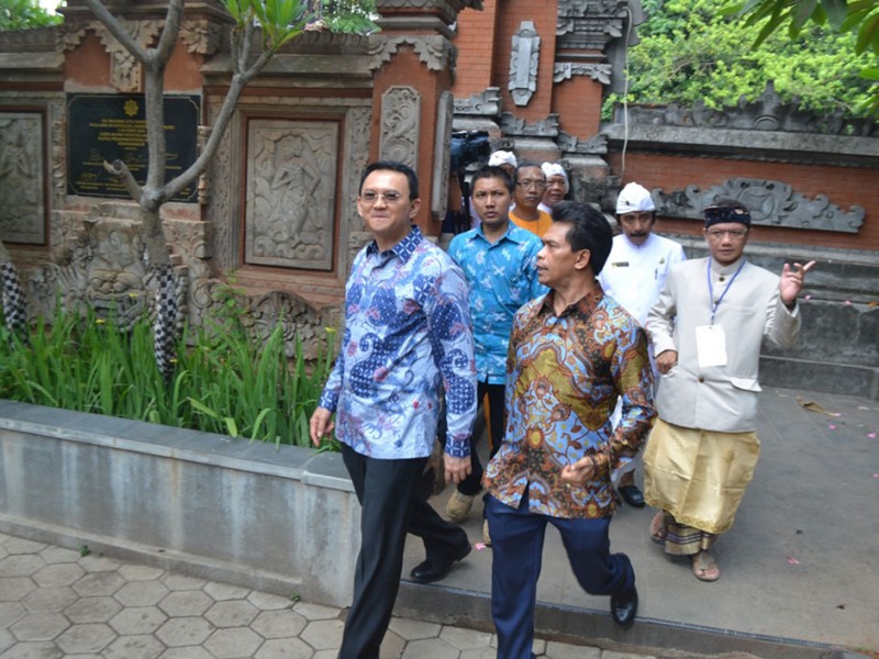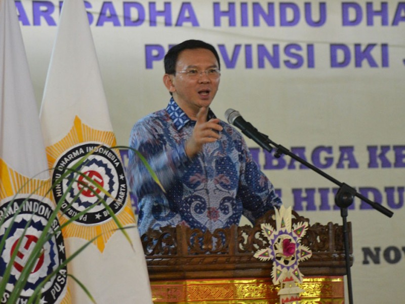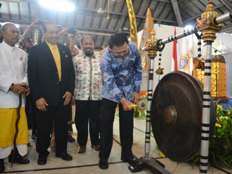 Gubernur DKI Jakarta, Basuki Tjahaja Purnama memberikan sambutan sekaligus membuka acara Lokasabha VI Parisadha Hindu Dharma Indonesia.DKI di Pura Aditya Jaya Rawamangun, Pulogadung, Jakarta Timur, Sabtu (14/11/2015). Dalam sambutanya Basuki mengajak seluruh umat Hindu di Jakarta untuk mendukung program 5 tertib, yakni tertib kebersihan, hunian, unjuk rasa, lalu lintas dan pedagang kaki lima.(Foto:yopie@beritajakarta.com)