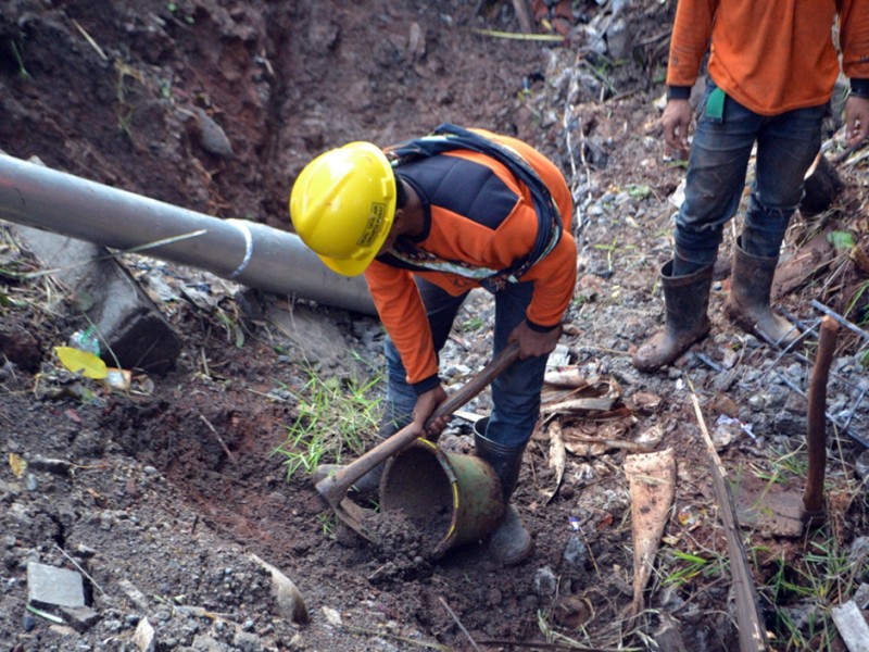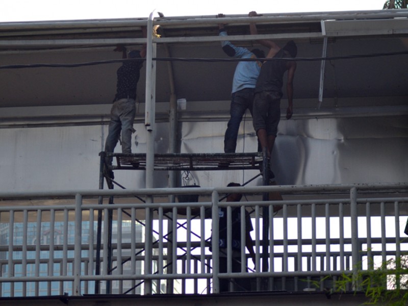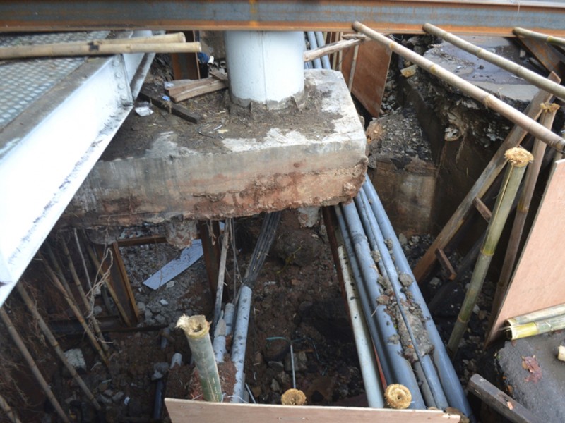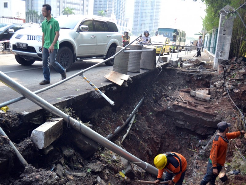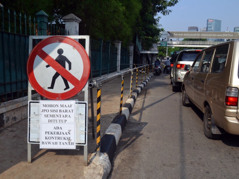 Akses masuk ke Jembatan Penyeberangan Orang (JPO) Halte Trans Jakarta Polda Metro Jaya, Jalan Sudirman, Jakarta Pusat ditutup karena sedang ada perbaikan setelah tanah di dekatnya ambles,Pada hari Rabu (11/11/2015) lalu. Dishubtrans DKI Jakarta menutup JPO di sisi barat. Pantaun beritajakarta.com pekerjaan perbaikan sedang ditangani oleh Sudin Tata Air Jakarta Pusat, Selasa (24/11/2015). (Foto : Yopie/Beritajakarta.com)