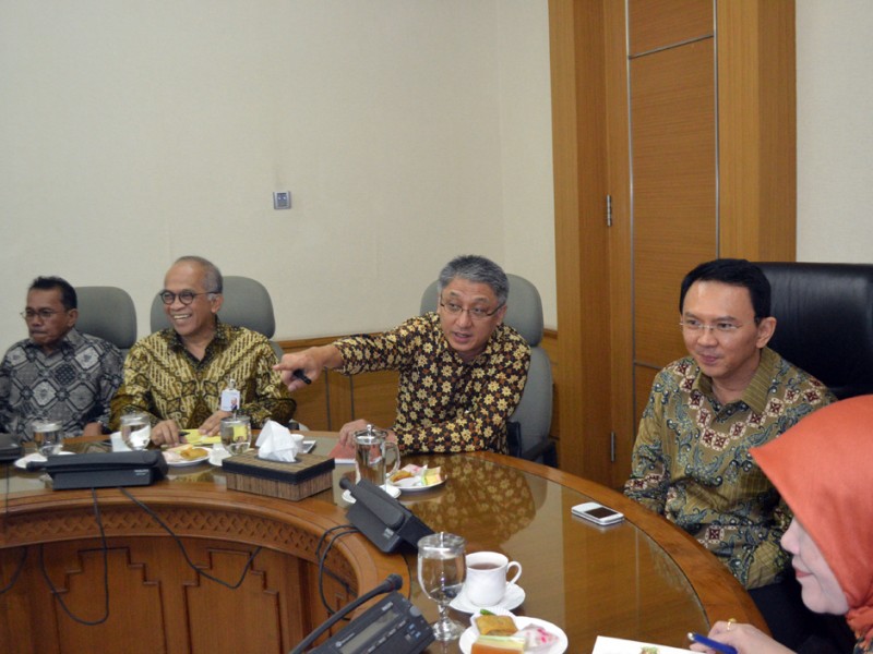 Komisaris Utama PT Bank DKI, Honggo Widjojo bersama jajaran Direksi menemui Gubernur DKI Jakarta, Basuki Tjahaja Purnama, di Balai Kota DKI Jakarta, Selasa (1/12/12015). Dalam kesempatan tersebut Basuki menerima penyampaian terkait kesiapan IT Sistem Terintegrasi untuk konsep Kartu Bank DKI multi fungsi sebagai upaya mewujudkan Jakarta sebagai cashless society. (Foto : Yopie/Beritajakarta.com)