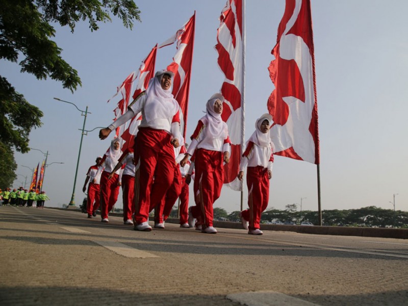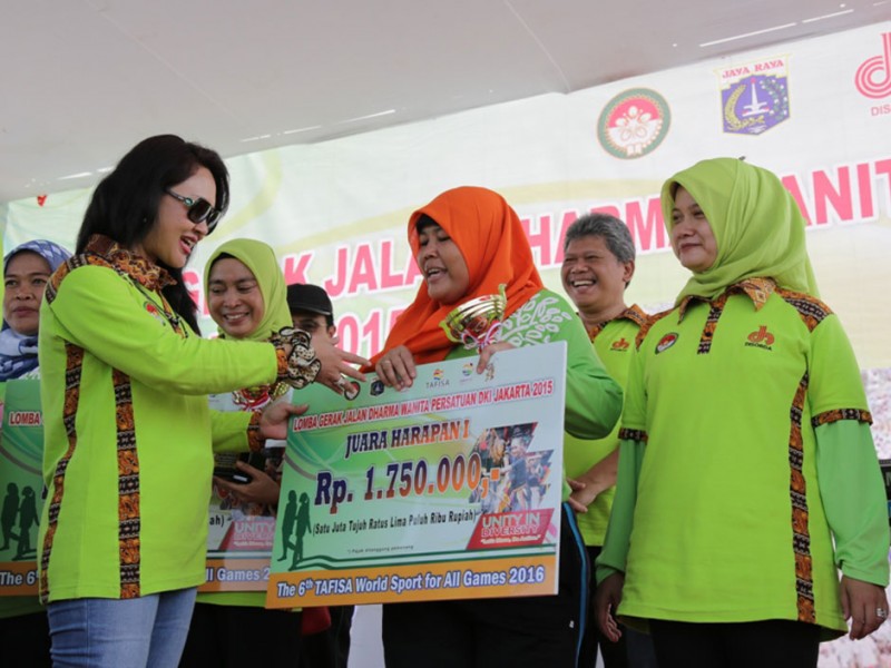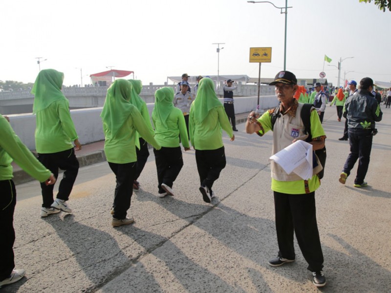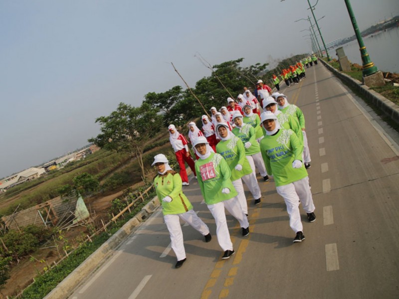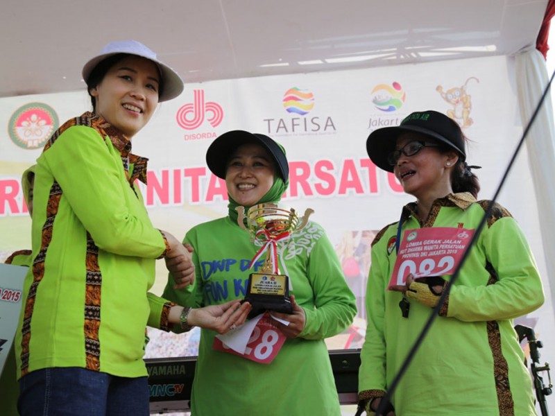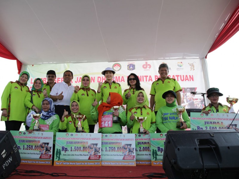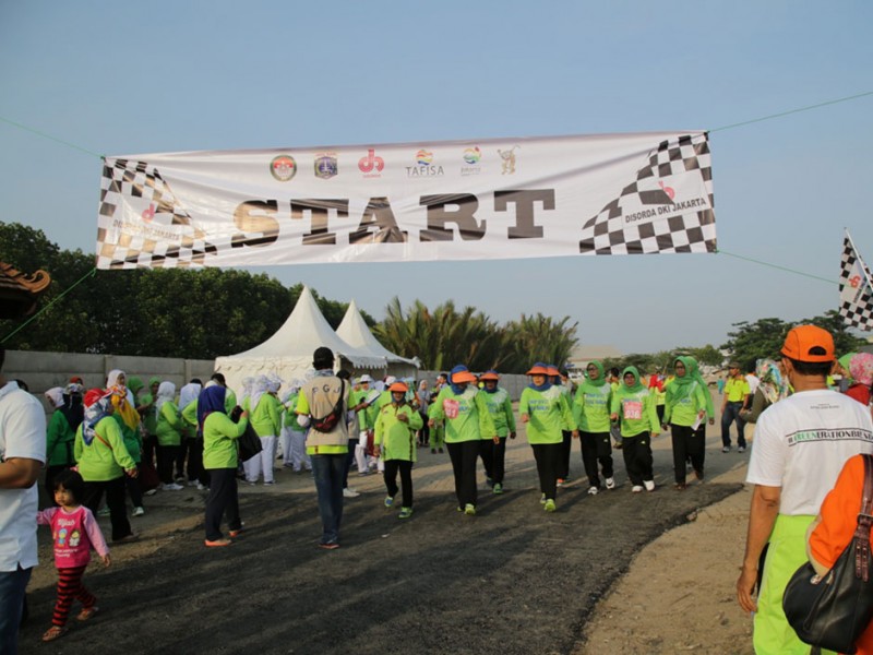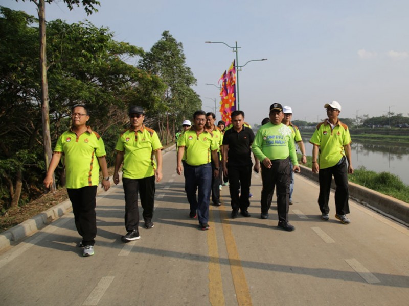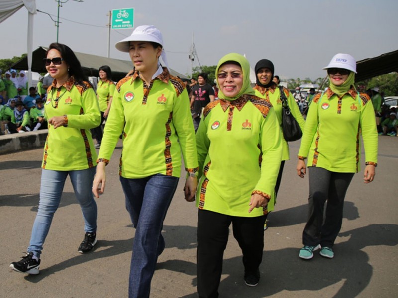 Sebanyak 1.500 anggota Dharma Wanita Persatuan Provinsi DKI Jakarta mengikuti lomba gerak jalan sehat di Jalan Inspeksi Banjir Kanal Timur (KBT), Kelurahan Marunda, Kecamatan Cilincing, Jakarta Utara, Sabtu (4/12/2015). Gerak jalan sehat dalam rangka memeriahkan HUT Dharma Wanita Persatuan DKI Jakarta ini di hadiri , Sekretaris Daerah Provinsi DKI Jakarta Saefullah, Ketua Tim Penggerak Pembinaan Kesejahteraan Keluarga (TP PKK) DKI Jakarta Veronica Tjahaja Purnama, Wakil Ketua Tim Penggerak Pemberdayaan Kesejahteran Keluarga, dan Ketua Dharma Wanita Persatuan DKI Jakarta Rusmiati Saefullah. (Foto: Yopie/beritajakarta.com)