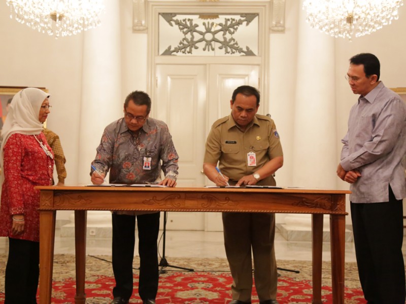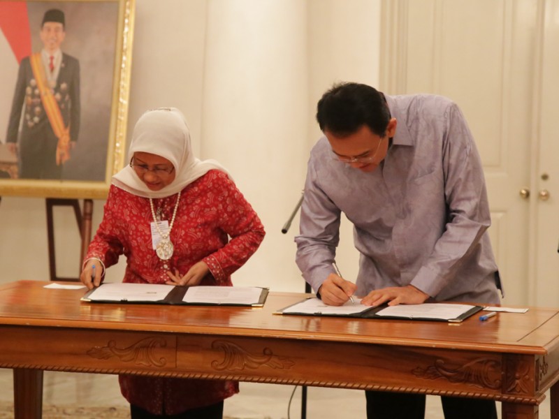 Pemerintah Provinsi DKI Jakarta dan Kementerian Pekerjaan Umum dan Perumahan Rakyat (PUPR) menyepakati kerjasama Penyelenggaraan Rumah Susun Pasar Rumput, Jakarta Selatan. Prosesi Penandatanganan Kesepakatan Bersama dilakukan Gubernur DKI Jakarta, Basuki Tjahaja Purnama dan Staf Ahli Bidang Hubungan Antar Lembaga Menteri PUPR, Mirna Amin. Sementara Perjanjian Kerjasama ditandatangani Sekretaris Daerah Provinsi DKI Jakarta, Saefullah dengan Staf Ahli Bidang Ekonomi dan Investasi Menteri PUPR, Khalawi Abdul Hamid di Balai Kota DKI Jakarta, Selasa (8/12/2015). (Foto: Yopie/beritajakarta.com)