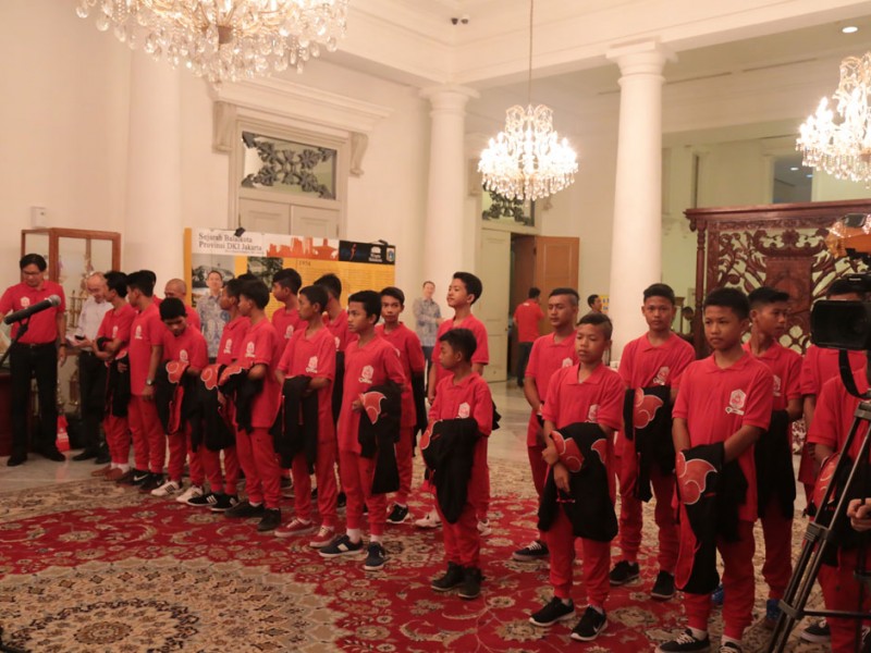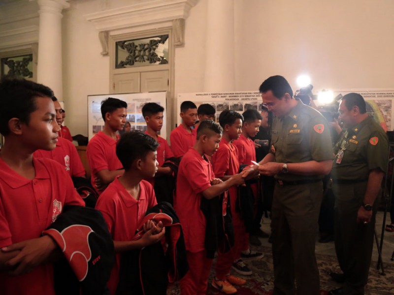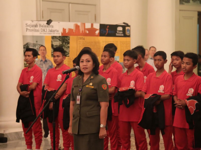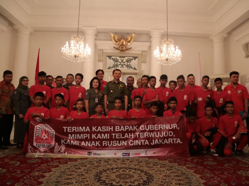 Gubernur DKI Jakarta, Basuki Tjahaja Purnama, melepas keberangkatan tim yang sudah menjuarai Jakarta Football Festival Rusun Cup 2015 untuk menimba ilmu di sejumlah klub sepakbola di Spanyol, Senin (14/12/2015). Sebanyak 22 anak-anak dan 8 orang official tim dari Rusun Daan Mogot akan berlatih di tiga klub sepakbola kenamaan yakni, Barcelona, Real Madrid dan Atletico Madrid.(Foto: Reza/beritajakarta.com)