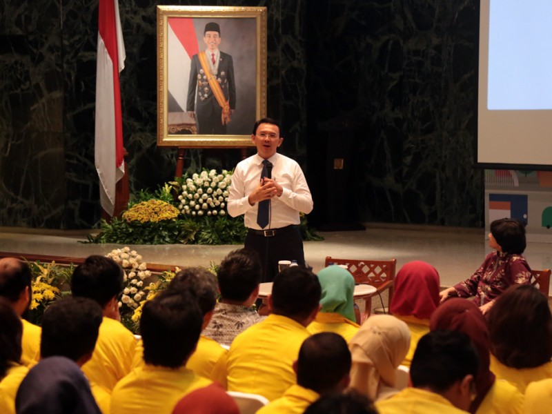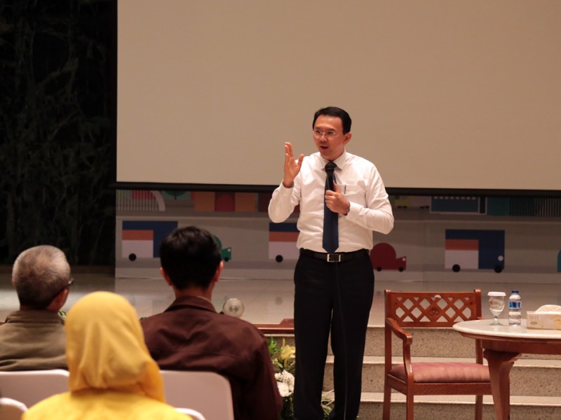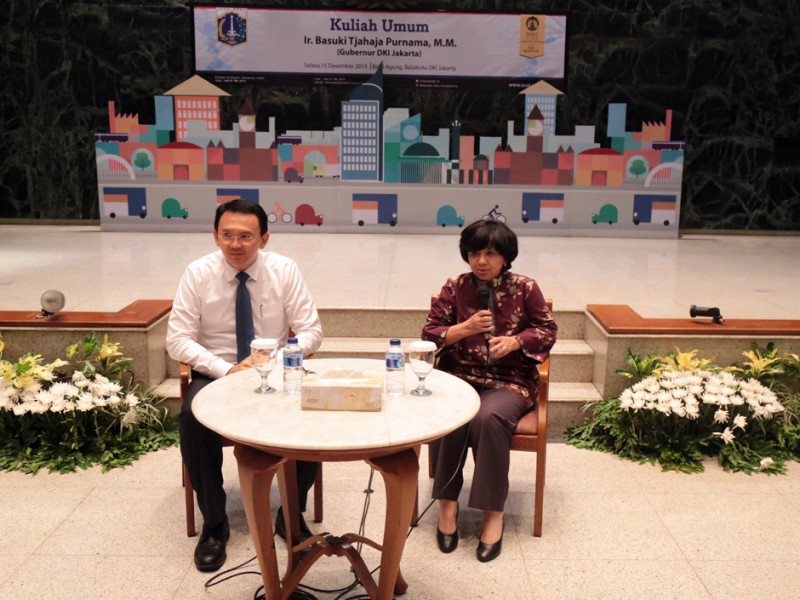 Gubernur DKI Jakarta, Basuki Tjahaja Purnama memberikan kuliah umum kepada mahasiswa Fakultas Ilmu Komputer Universitas Indonesia di Balai Kota DKI Jakarta, Selasa (15/12/2015). Dalam kesempatan tersebut Basuki menyampaikan tentang Jakarta Smart City. (Foto : Reza/Beritajakarta.com)