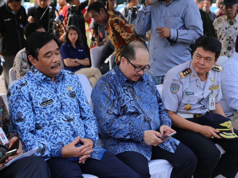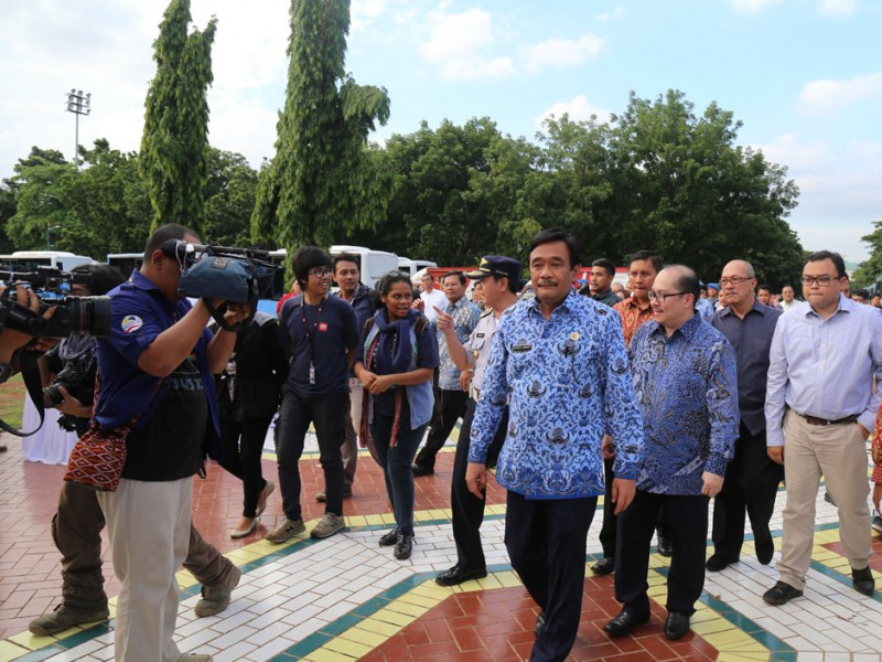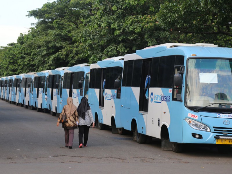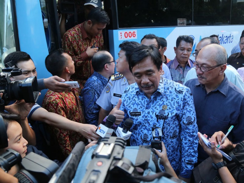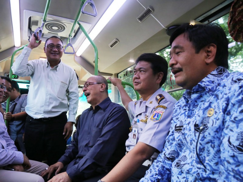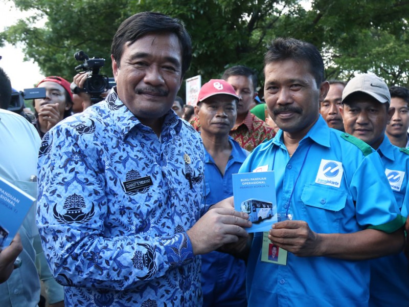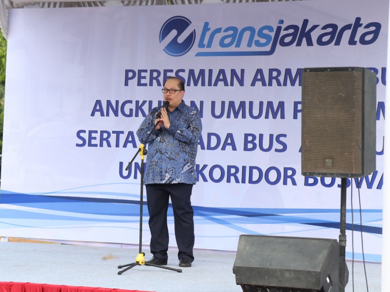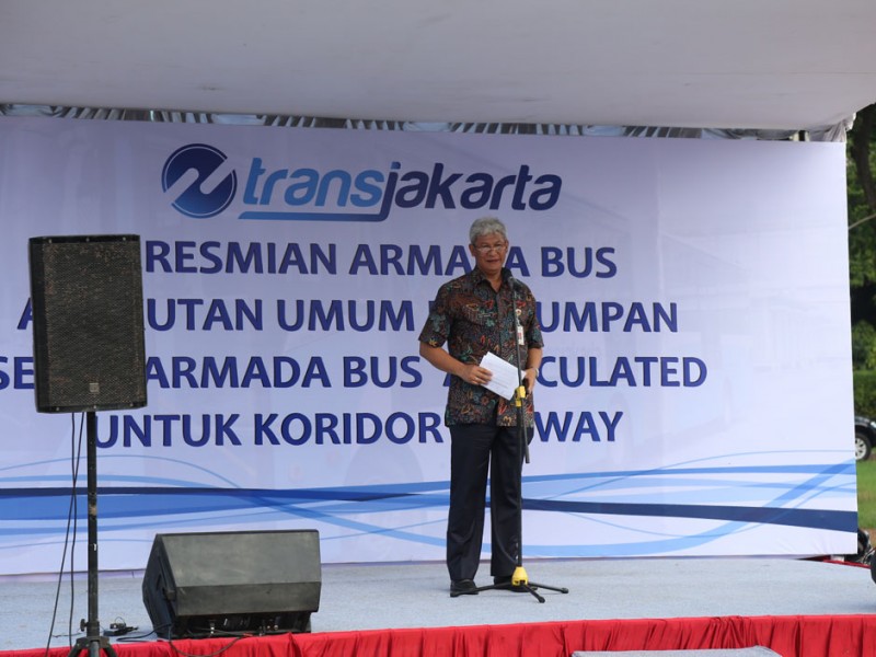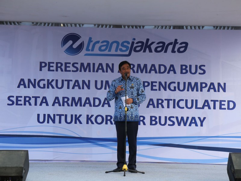 Wakil Gubernur DKI Jakarta, Djarot Saiful Hidayat, meluncurkan 320 armada bus pengumpan (feeder) dan 31 bus Transjakarta artculated (gandeng), di Parkir Timur, Senayan, Jakarta Pusat, Selasa (22/12/2015). Para pengguna jasa angkutan ini akan dikenakan tarif sama dengan tarif bus Transjakarta. Sementara, sopir atau pramudi bus mendapatkan gaji per bulan senilai dua kali UMP tanpa sistem setoran.(Foto: Reza / Beritajakarta.com)