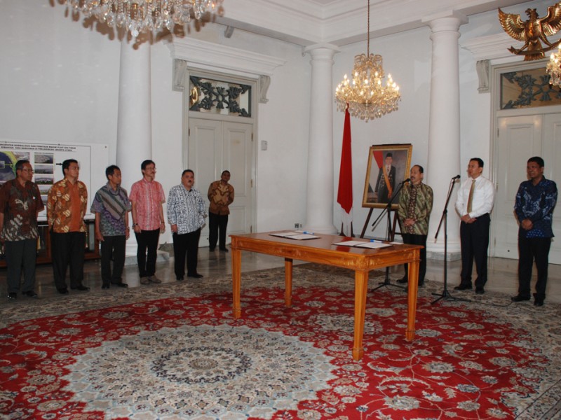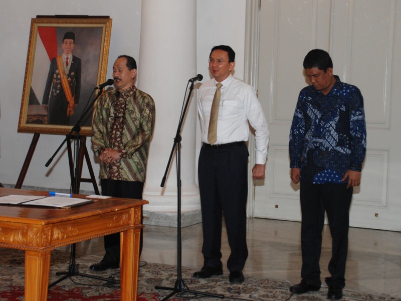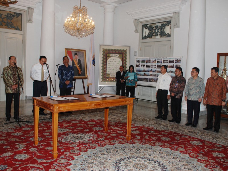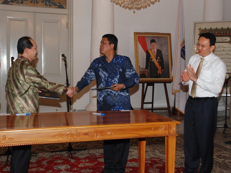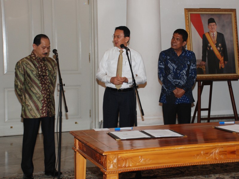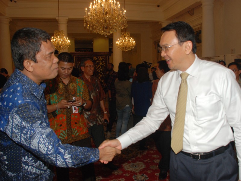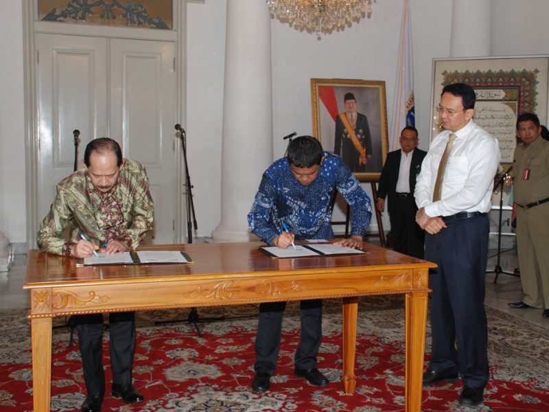 Gubernur DKI Jakarta, Basuki Tjahaja Purnama menyaksikan penandatanganan Memorandum of Understanding (MoU) antara PAM Jaya dengan PAL Jaya di Balai Kota DKI Jakarta, Rabu (23/12/2015). Melalui kerjasama ini diharapkan suplai air bersih untuk warga Jakarta dapat dilakukan lebih baik serta kelestarian lingkungan dapat terjaga. (Foto: Yopie/beritajakarta.com)