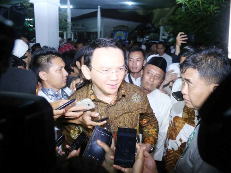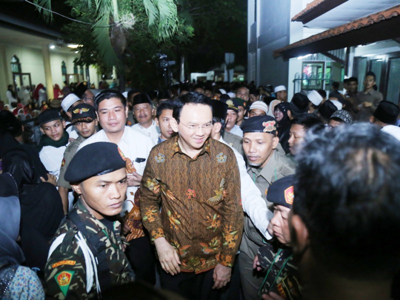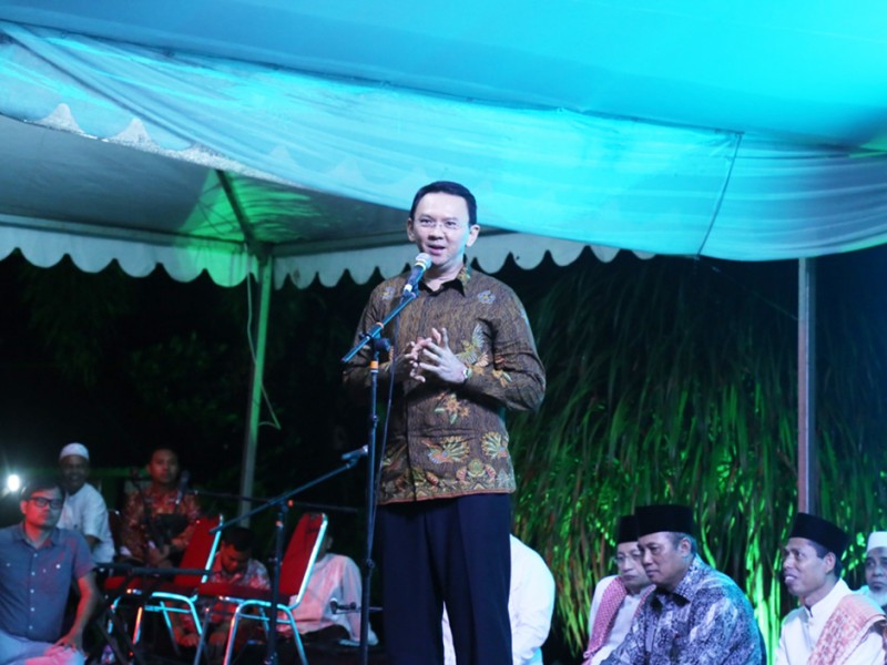 Gubernur DKI Jakarta, Basuki Tjahaja Purnama menghadiri Haul ke-6 KH Abdurahman Wahid (Gus Dur) di Jalan Warung Silah, Kelurahan Ciganjur, Kecamatan Jagakarsa, Jakarta Selatan, Sabtu (26/12/2015) malam. Dalam testimoninya Basuki mengenang Gus Dur pernah mengatakan kepadanya, \"Jangankan Menjadi Gubernur Menjadi Presiden pun Bisa\". (Foto : Reza/Beritajakarta.com)