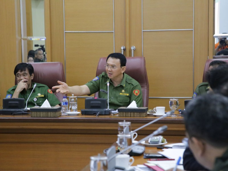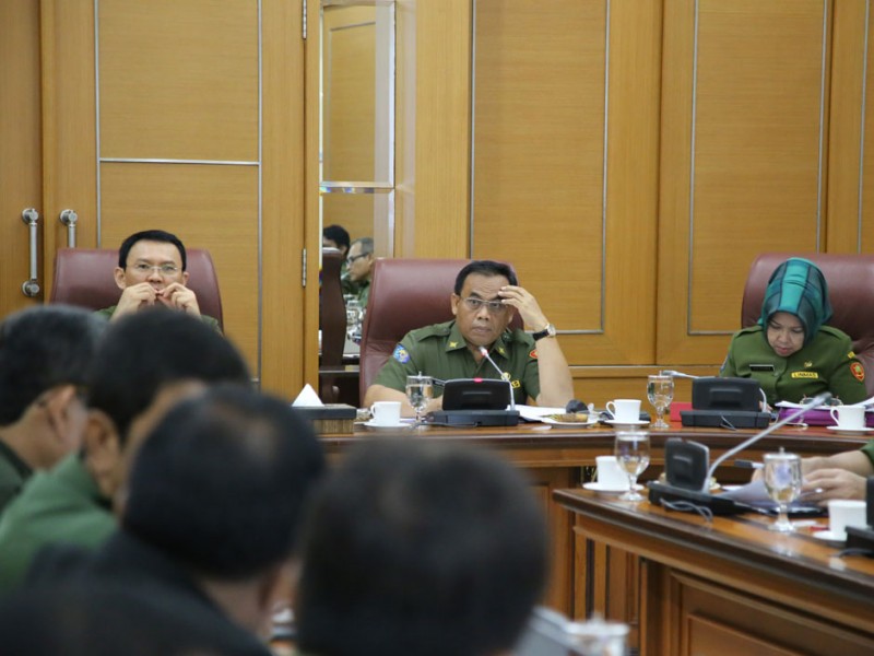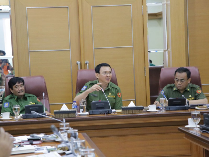 Gubernur DKI Jakarta, Basuki Tjahaja Purnama memimpin rapat rutin bersama jajaran Satuan Kerja Perangkat Daerah (SKPD) di Balai Kota DKI Jakarta, Senin (28/12/2015). Dalam rapat ini Basuki mendengarkan paparan dan memberikan masukan mengenai progres pelaksanaan lelang dan pengadaan dalam APBD Tahun Anggaran 2016. (Foto: Yopie / Beritajakarta.com)