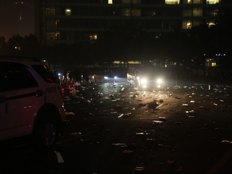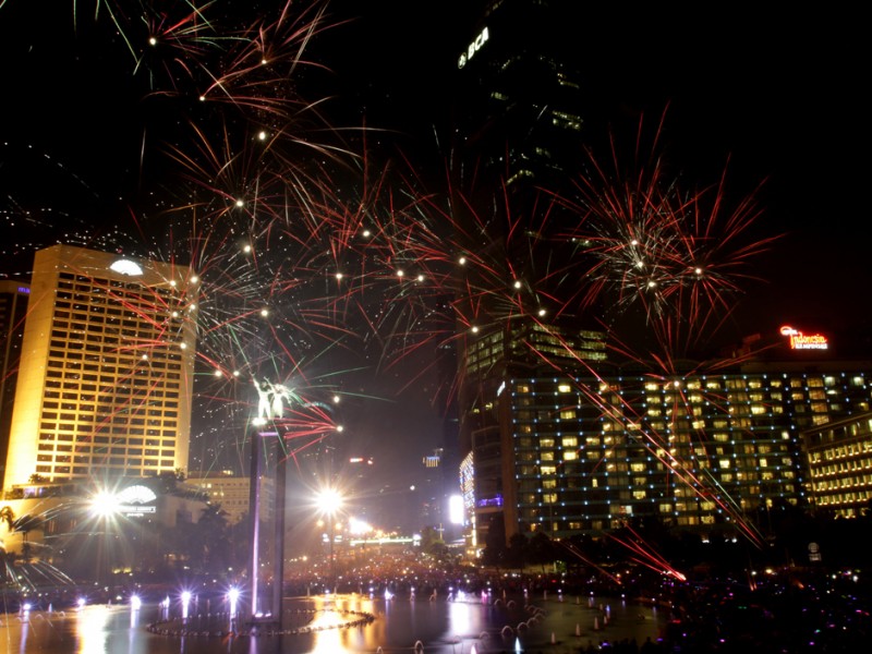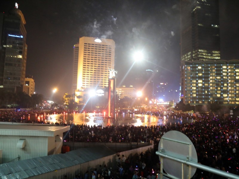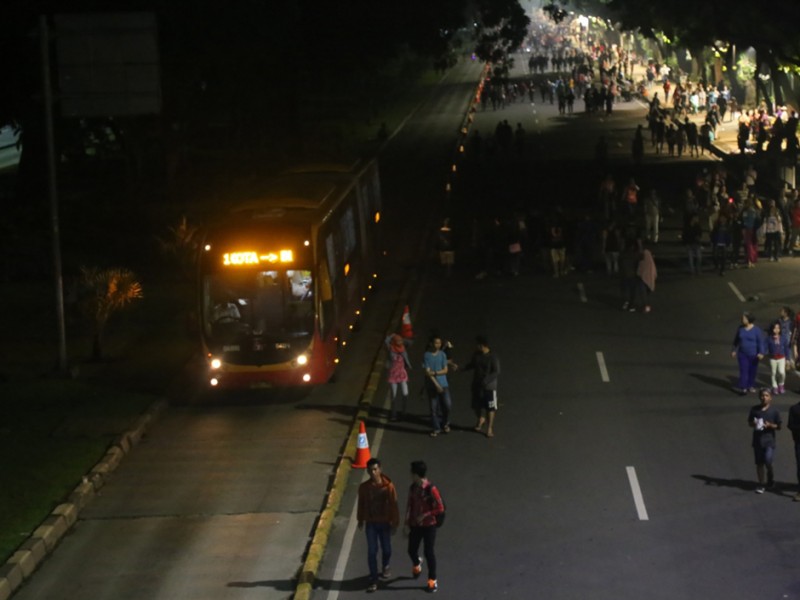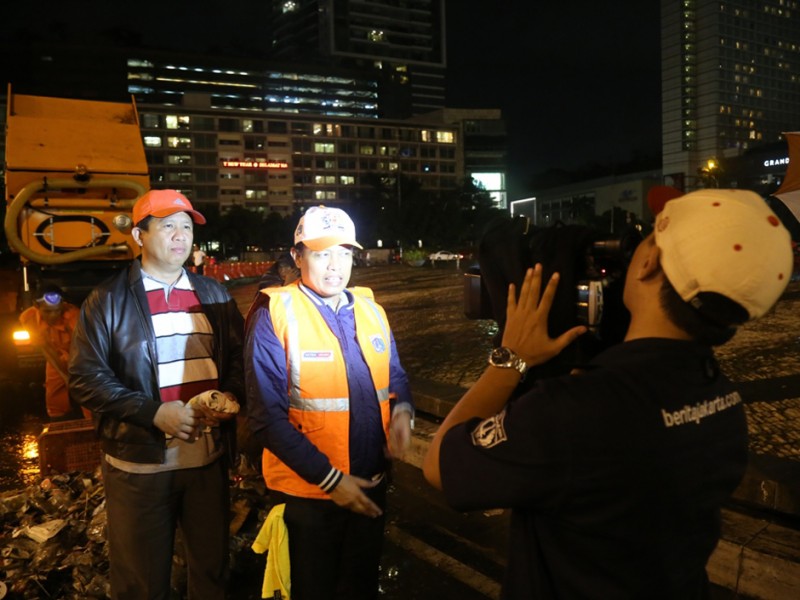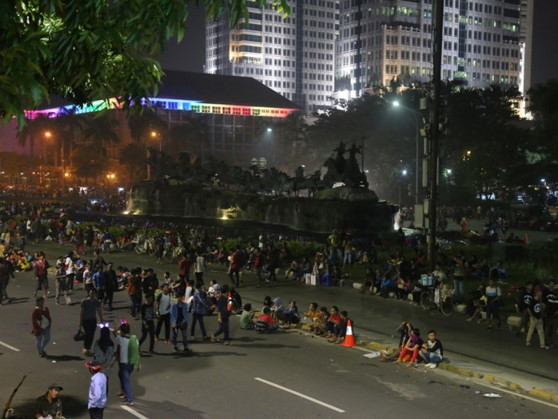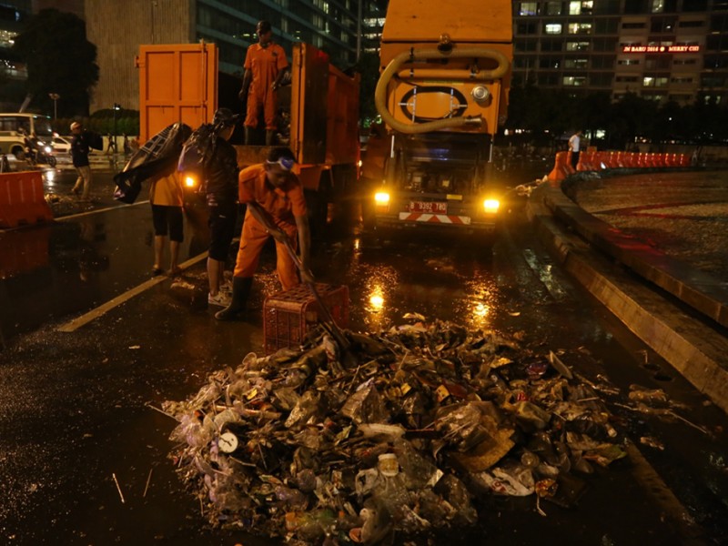 Ribuan warga merayakan pergantian tahun bertajuk Car Free Night di Jalan Jenderal Sudirman sampai Jalan MH Thamrin, Jakarta Pusat. Banyaknya warga yang datang berbanding lurus dengan meningkatnya volume sampah di sepanjang jalan tersebut. Petugas dari Dinas Kebersihan DKI Jakarta pun bertindak sigap membersihkan sampah-sampah usai perayaan tahun baru selesai. (Foto: Reza/beritajakarta.com)