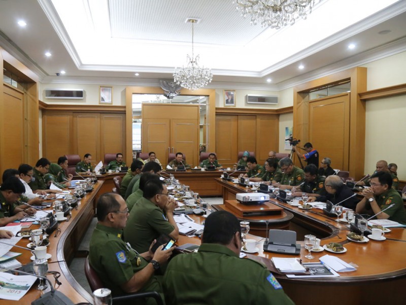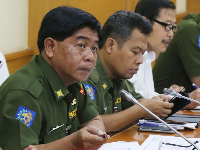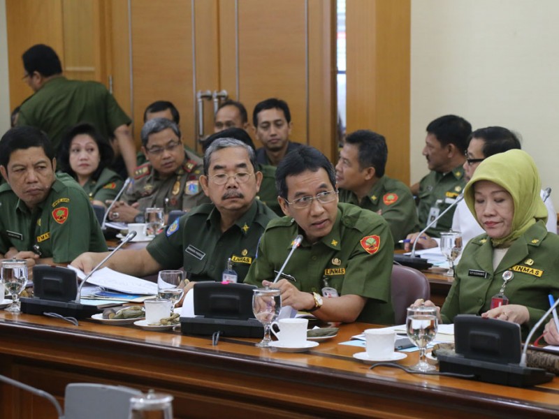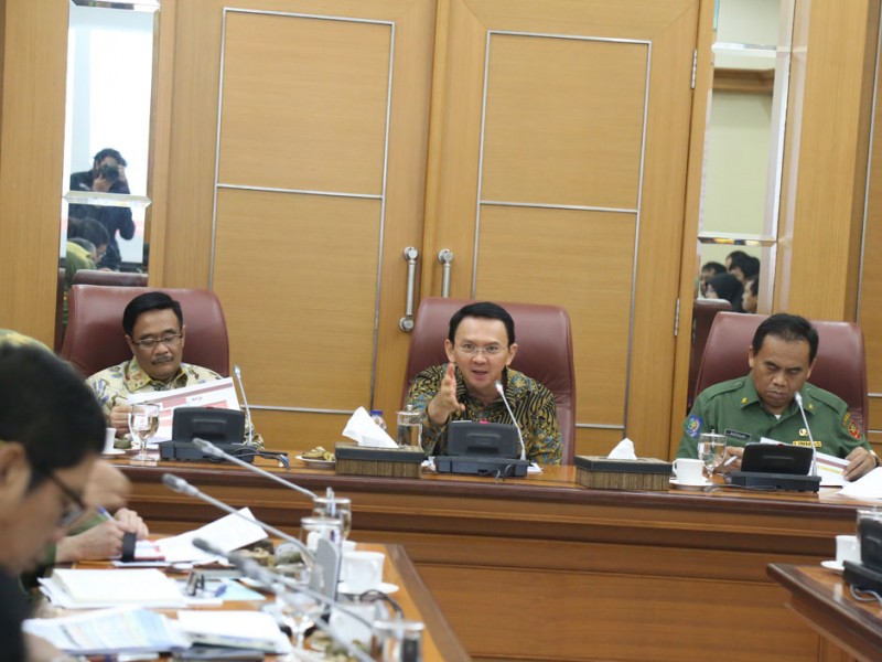 Gubernur DKI Jakarta, Basuki Tjahaja Purnama memimpin rapat bersama jajaran Satuan Kerja Perangkat Daerah (SKPD) di Balai Kota DKI Jakarta, Senin (4/1/2016). Salah satu topik pembahasan dalam rapat yakni terkait tewasnya karyawati bus Transjakarta dengan dugaan sementara akibat kesetrum. Dalam kesempatan tersebut Basuki memerintahkan Kepala Dinas Perindustrian dan Energi Provinsi DKI Jakarta, Yuli Hartono, untuk melakukan pengecekan dan perbaikan instalasi penerangan jalan umum (PJU) dan jembatan penyeberangan orang (JPO).(Foto: Reza / Beritajakarta.com)