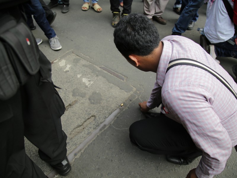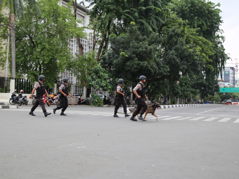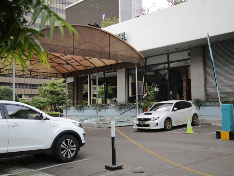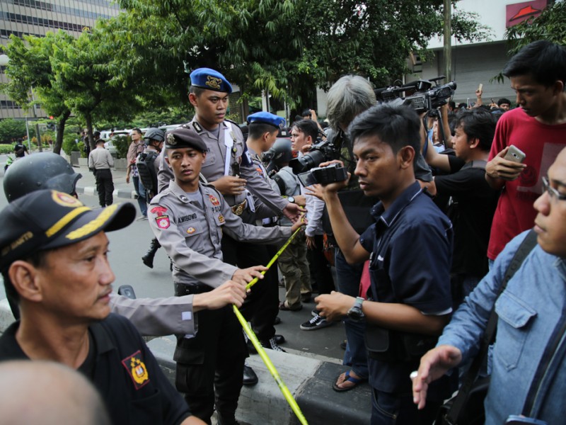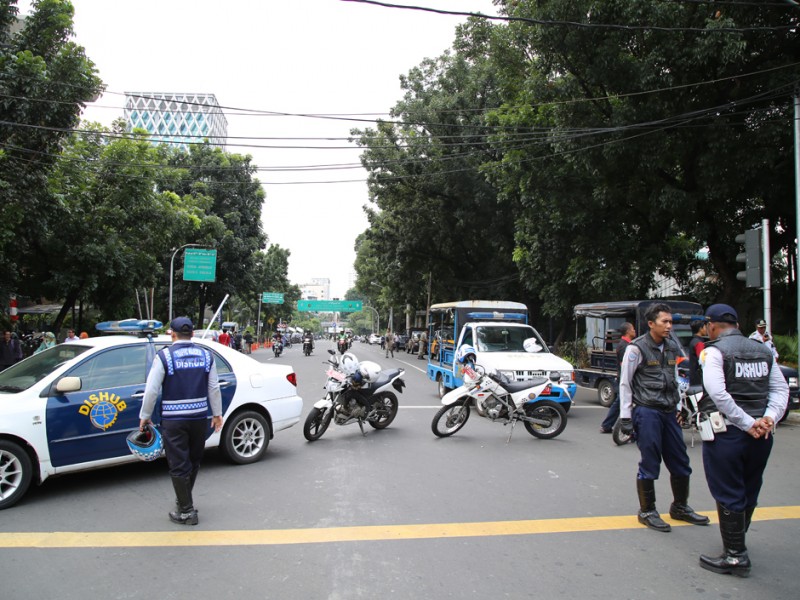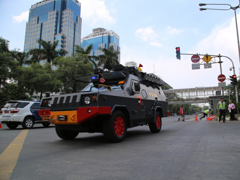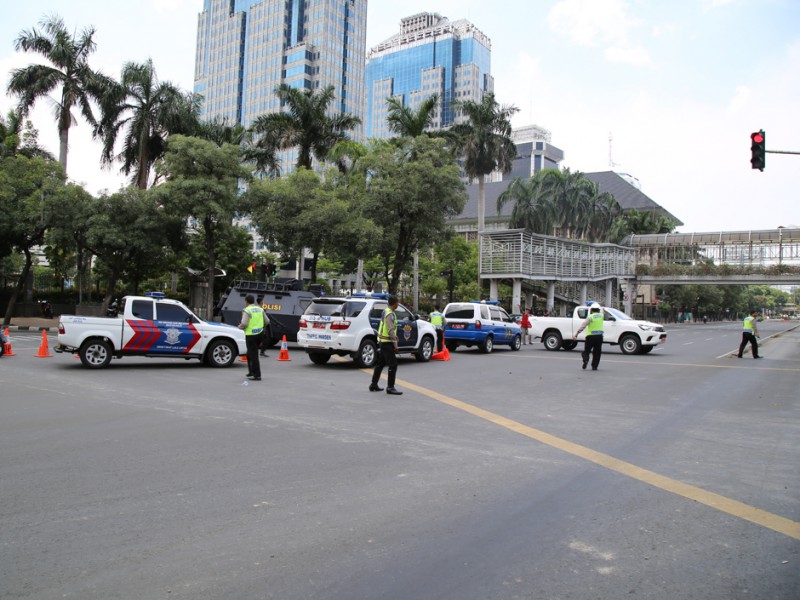 Pasca terjadinya serangan teror di pusat perbelanjaan Sarinah dan Pos Polisi di Jalan MH Thamrin, Jakarta Pusat, Kamis (14/1/2015), personil Kepolisian langsung melakukan strelisasi dan olah Tempat Kejadian Perkara (TKP). Selain itu, petugas dari Dinas Perhubungan dan Transportasi, Satuan Polisi Pamong Praja dan Dinas Penanggulangan Kebakaran dan Penyelamatan DKI Jakarta juga dikerahkan untuk memberikan bantuan. (Foto: Yopie/beritajakarta.com)