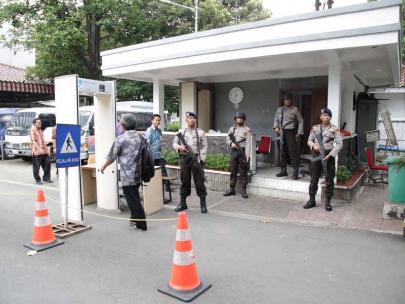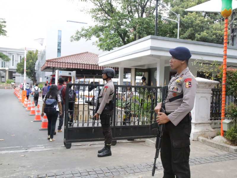 Pasca serangan teror di kawasan Sarinah, Jalan MH Thamrin, Jakarta Pusat, Kamis (14/1/2015) kemarin, pengamanan di Balai Kota DKI Jakarta, diperketat. Sejumlah personil Kepolisian bersenjata lengkap, Jumat (15/1/2016), berjaga untuk mengatisipasi hal-hal yang tidak diinginkan.(Foto: Yopie/ Beritajakarta.com)