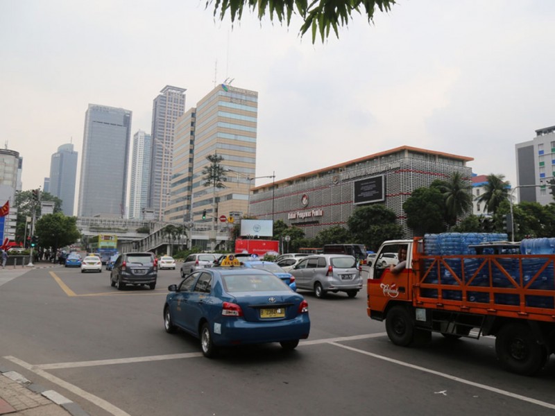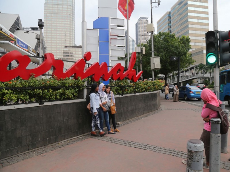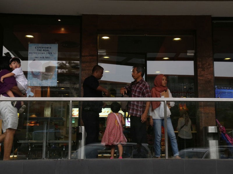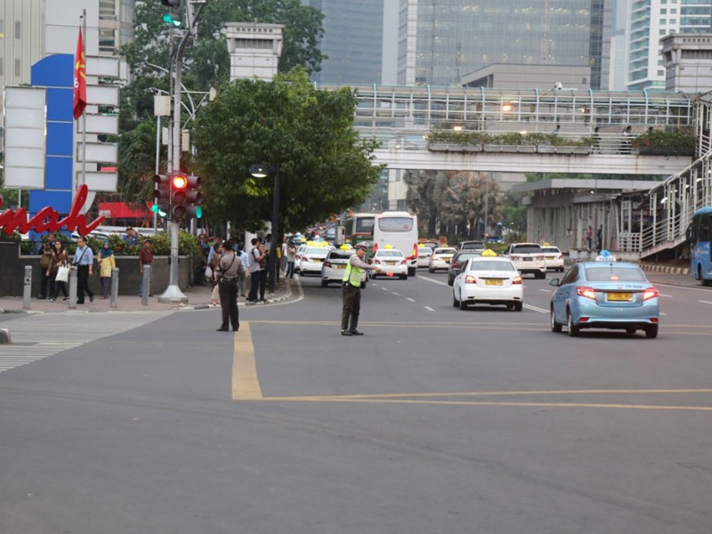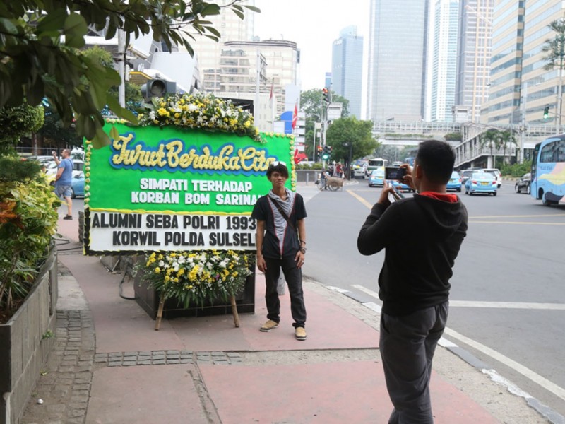 Pasca serangan teroris 14 Januari lalu, kondisi dan aktifitas di Kawasan Sarinah jalan MH Thamrin kembali normal dan kondusif, Senin (18/01/2016). Masyarakat beraktifitas kembali seperti biasa dan petugas keamanan masih berjaga ditempat kejadian perkara.(Foto: Reza/beritakjakarta.com)