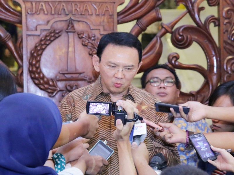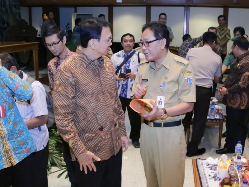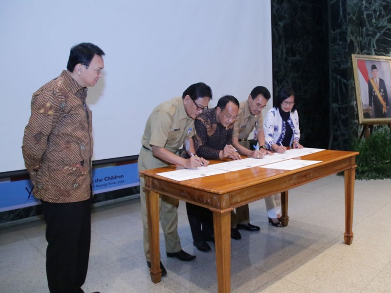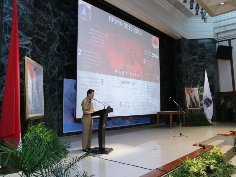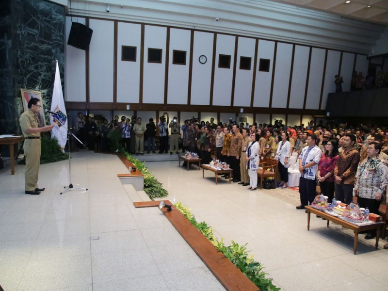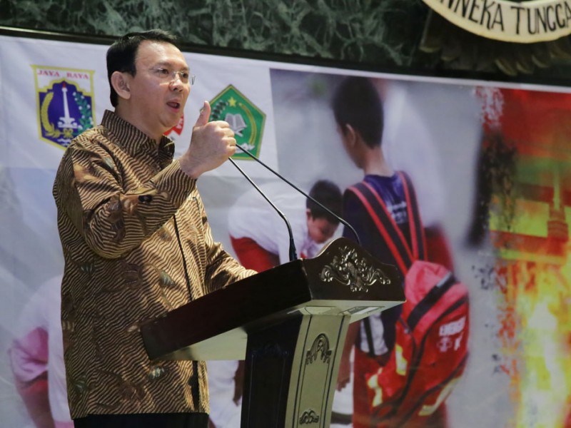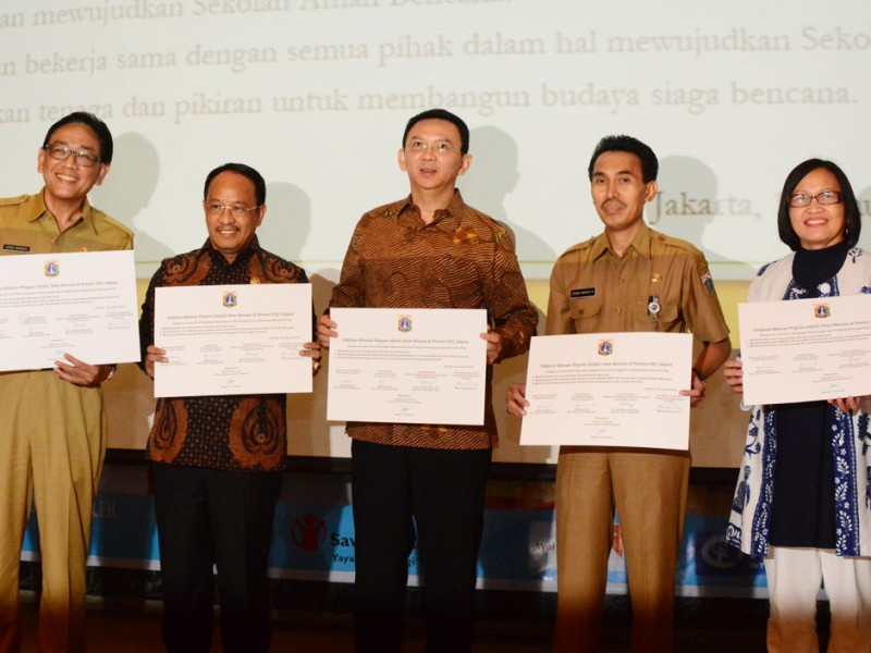 Gubernur DKI Jakarta, Basuki Tjahaja Purnama meresmikan Program Sekolah Aman Bencana Provinsi DKI Jakarta, di Balai Kota DKI Jakarta, Selasa (19/1/2016). Dalam peresmian ini 400 kepala sekolah dari berbagai jenjang pendidikan ikut membacakan Deklarasi Rintisan Program Sekolah Aman Bencana Provinsi DKI Jakarta, yang dilanjutkan dengan penandatanganan deklarasi oleh oleh Gubernur DKI Jakarta, Basuki Tjahaja Purnama, Kepala Dinas Pendidikan DKI Jakarta Sopan Andrianto, Kepala Pelaksana Badan Penanggulangan Bencana Daerah (BPBD) DKI Jakarta, Denny Wahyu Haryanto serta Perwakilan Organisasi Penggiat Penanggulangan Bencana, Myrna Remata Evora. (Foto: Yopie/beritajakarta.com)