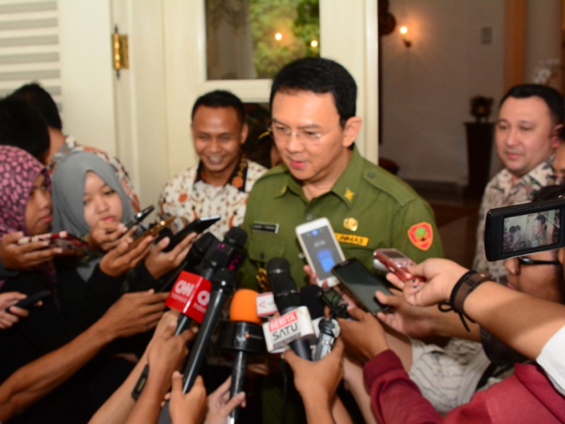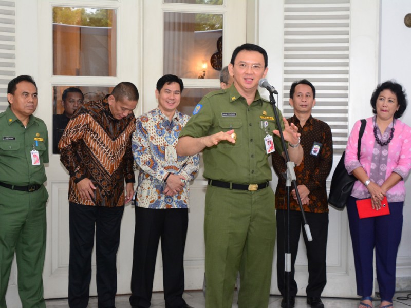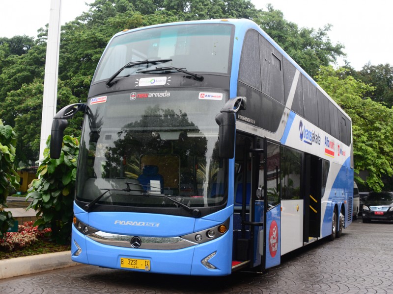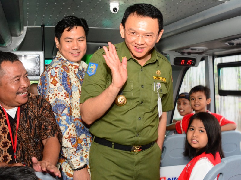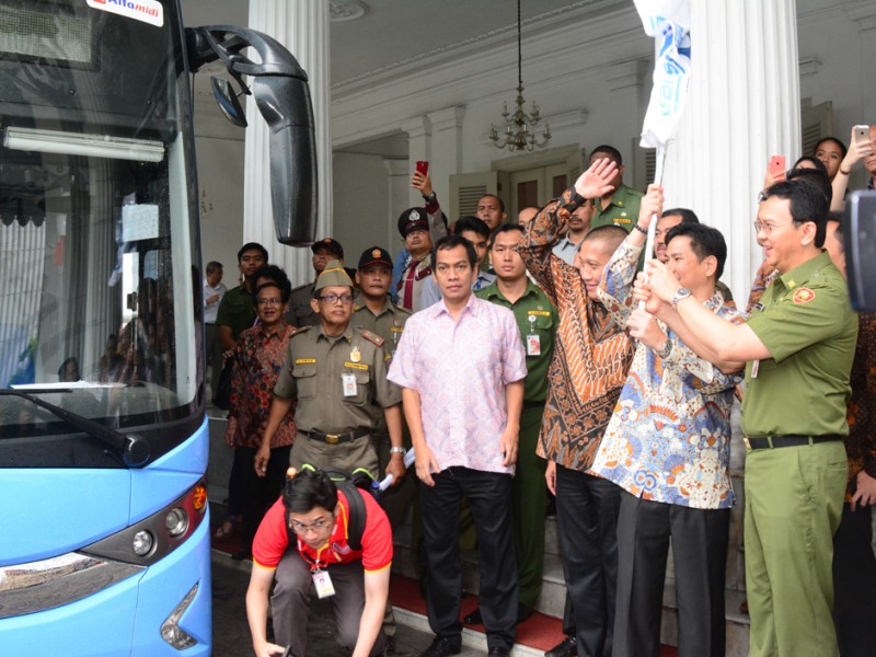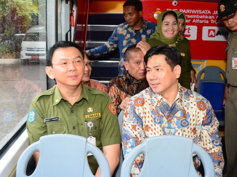 Gubernur DKI Jakarta, Basuki Tjahaja Purnama meresmikan pengoperasian Bus Tingkat City Tour di Balai Kota DKI Jakarta, Senin (25/1/2016). Bus tingkat City Tour dirancang khusus untuk ramah penyandang disabilitas. Bus tingkat dengan merek Mercedes Benz tipe OC 500 RF 2542 ini sebelumnya telah diserahkan ke Pemprov DKI sejak 26 Juni 2015 lalu namun terganjal aturan Kementerian Perhubungan, bus ini urung dioperasikan. Bus senilai Rp 3,9 miliar ini merupakan sumbangan dari pihak swasta dan memilki standar yang sama dengan sejumlah bus city tour yang telah beroperasi sebelumnya. (Foto: Rusmadi/Humas | Yopie/beritajakarta.com)