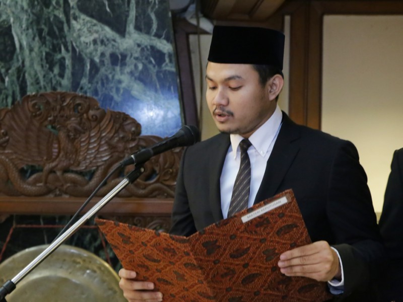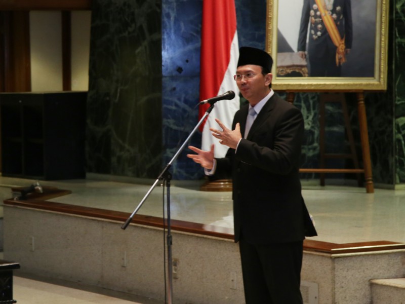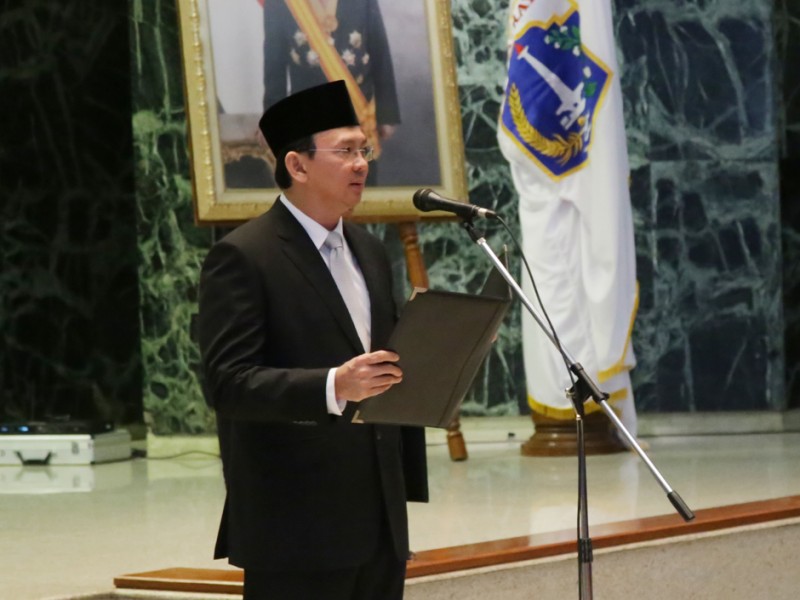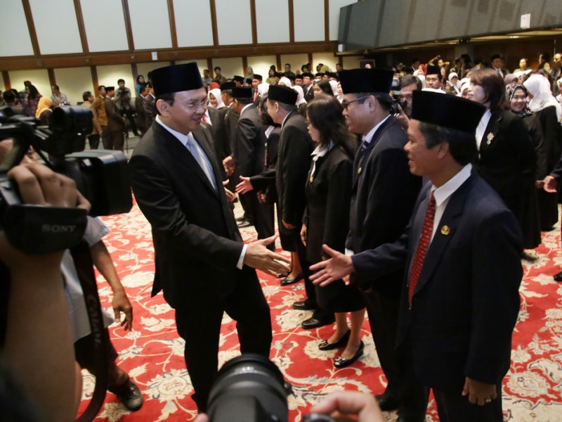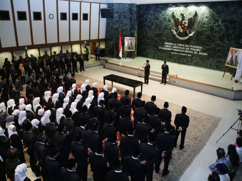 Gubernur DKI Jakarta, Basuki Tjahaja Purnama kembali melantik pejabat Administrator dan Pengawas di lingkungan Pemerintah Provinsi DKI Jakarta, di Balai Kota DKI Jakarta, Jumat (5/2/2016). Sebanyak 112 pejabat diambil sumpah jabatan dan dilantik sebagai pejabat eselon III dan eselon IV. Pejabat yang dilantik ini berasal dari Dinas kesehatan DKI Jakarta yang meliputi penyesuaian Struktur Organisasi Tata Kerja (SOTK) jabatan untuk pegawai Puskesmas yang sudah ditingkatkan menjadi Rumah Sakit Umum Daerah (RSUD) tipe D, Dinas Koperasi Usaha Mikro Kecil Menengah dan Perdagangan (KUMKMP), dan Dinas Penangulangan Kebakaran dan Penyelamatan DKI Jakarta. (Foto: Yopie/beritajakarta.com)