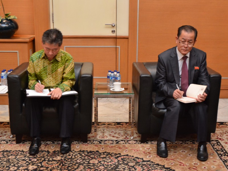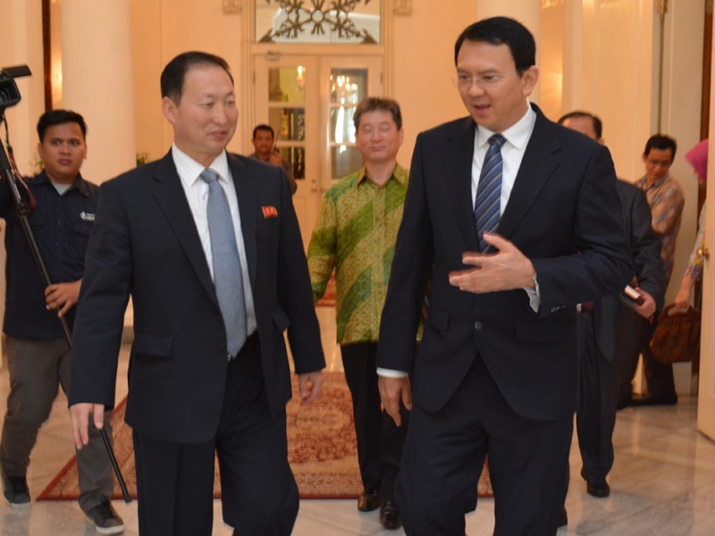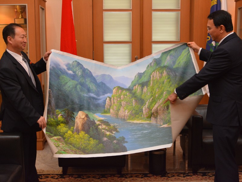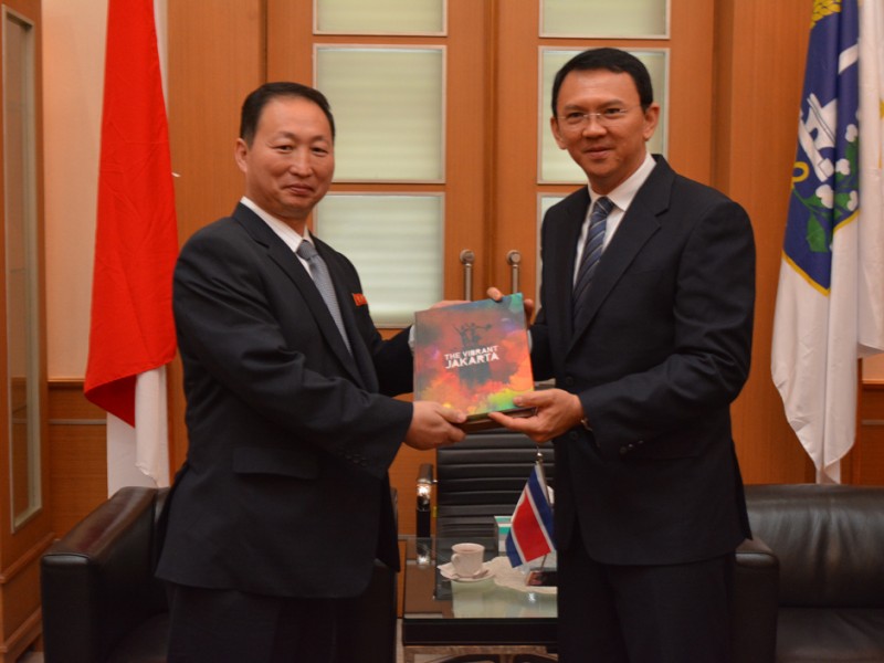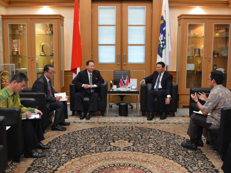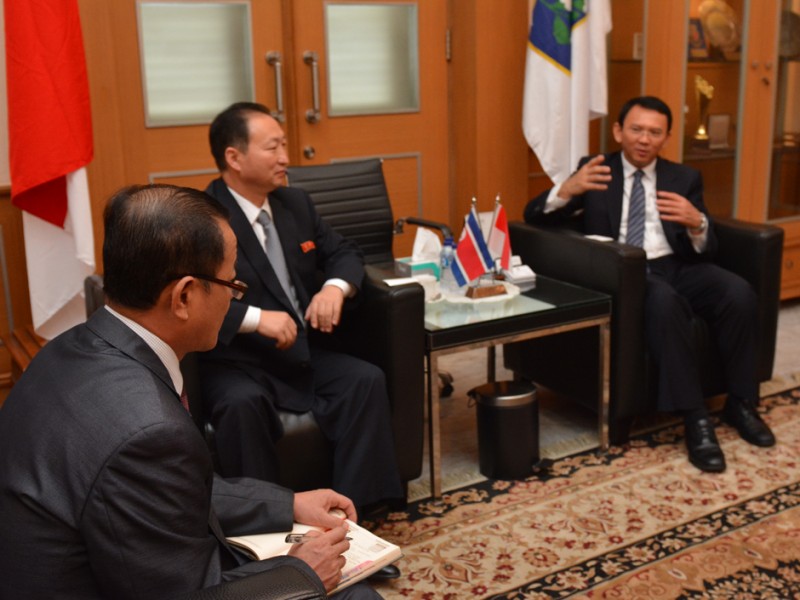 Gubernur DKI Jakarta, Basuki Tjahaja Purnama menerima kunjungan Duta Besar Korea Utara An Kwang II, di Balai Kota DKI Jakarta, Jumat (12/2/2016). Dalam kunjunganya An Kwang II mengundang Basuki untuk dapat berkunjung ke Pyongyang pada April mendatang guna mempererat kerjasama sister city antara Jakarta dan Pyongyang. (Foto: Masrizal/Humas | Yopie/Beritajakarta.com)