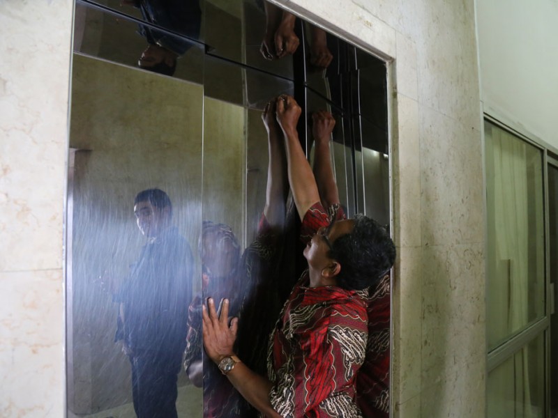 Diduga adanya rembesan air hujan lift Monumen Nasional (Monas) mengalami gangguan. Akibat gangguan ini Pengunjung untuk sementara tidak dapat menikmati pemandangan ibukota dari puncak Monas. Pengunjung hanya bisa menikmati pemandangan dari Cawan Monas. (Foto: Reza/beritajakarta.com)