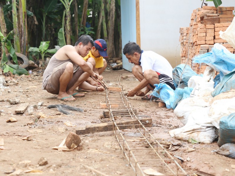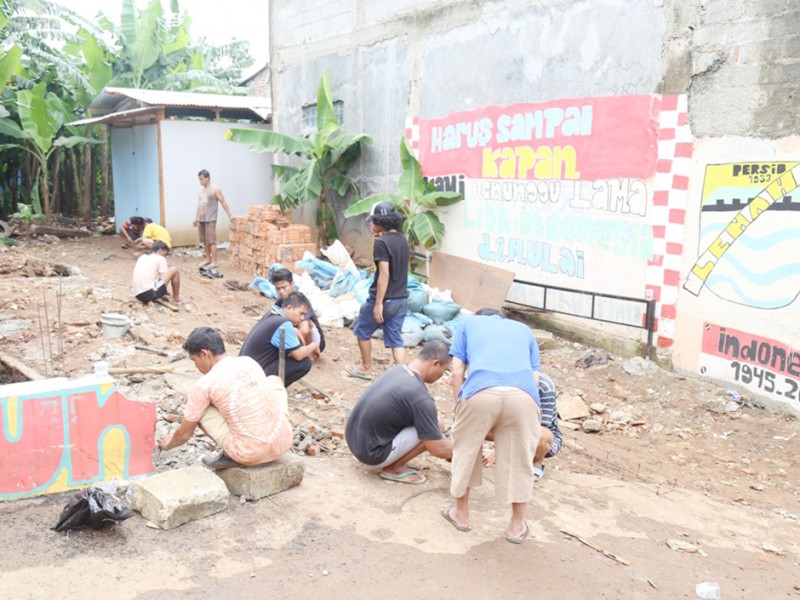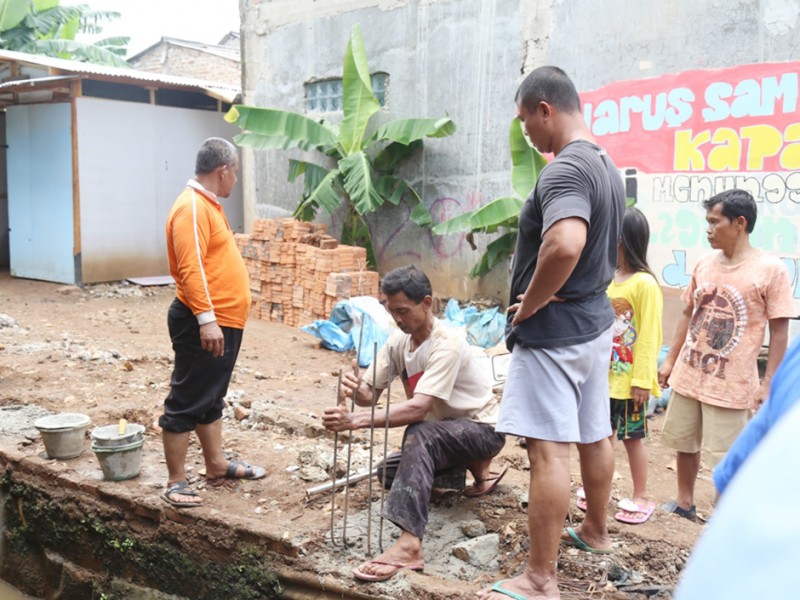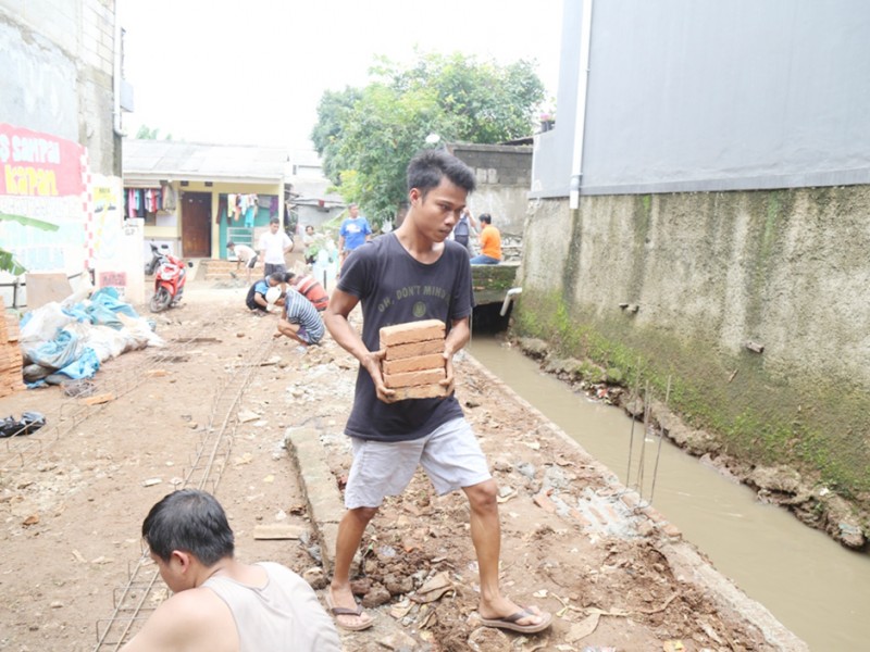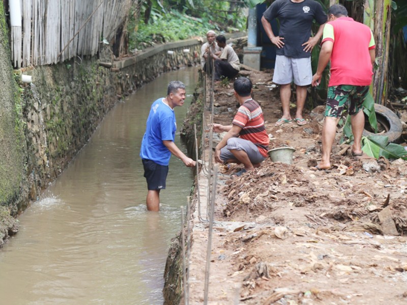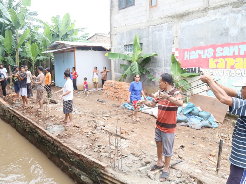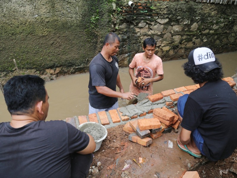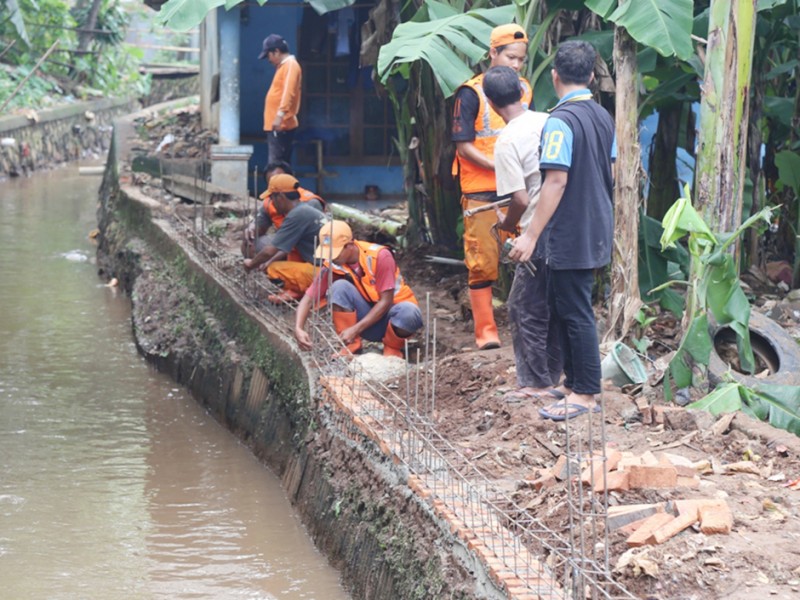Belasan Petugas sarana dan Prasarana Umum (PPSU) memperbaiki tanggul saluran Penghubung Setu di Jalan Meninjo, RT 006/05, Kelurahan Ciganjur, Kecamatan Jagakarsa, Jakarta Selatan. Sabtu 13/02 2016. Sebelumya tanggul ini jebol lantaran tidak kuat menahan debit air yang meningkat saat hujan deras Jumat kemarin. (Foto: Reza/beritajakarta.com)