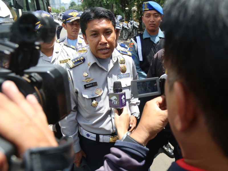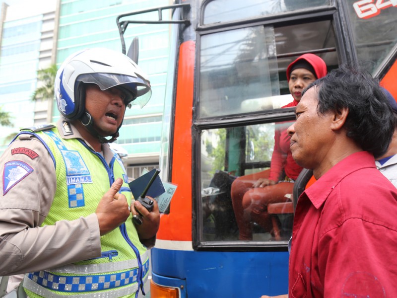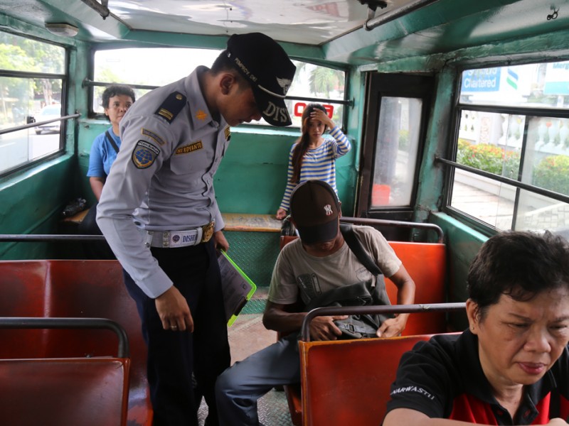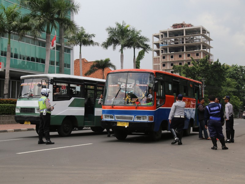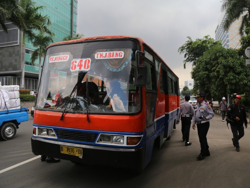 Petugas Suku Dinas Perhubungan dan Transportasi (Sudinhubtrans) Jakarta Pusat menggelar razia Angkutan Umum di Jalan Raya Fakhruddin, Tanah Abang, Jakarta Pusat. Senin, (15/2/2016). Razia digelar sebagai upaya tindak lanjut keluhan warga terkait banyaknya aksi kriminal di angkutan umum. Razia difokuskan pada penumpang angkutan umum Metromini 640 jurusan Pasar Minggu-Tanah Abang. (Foto: Reza/beritajakarta.com)