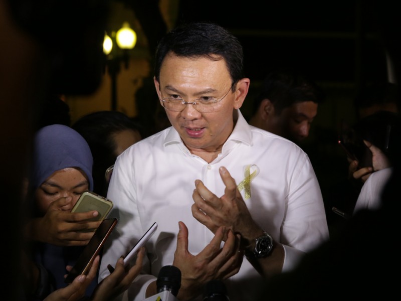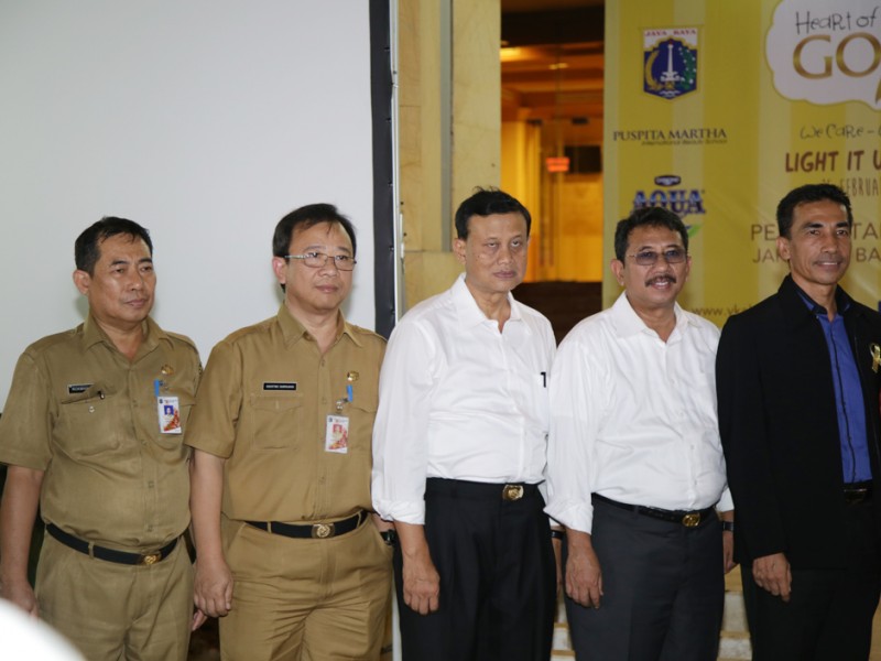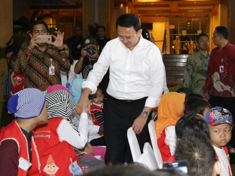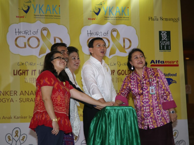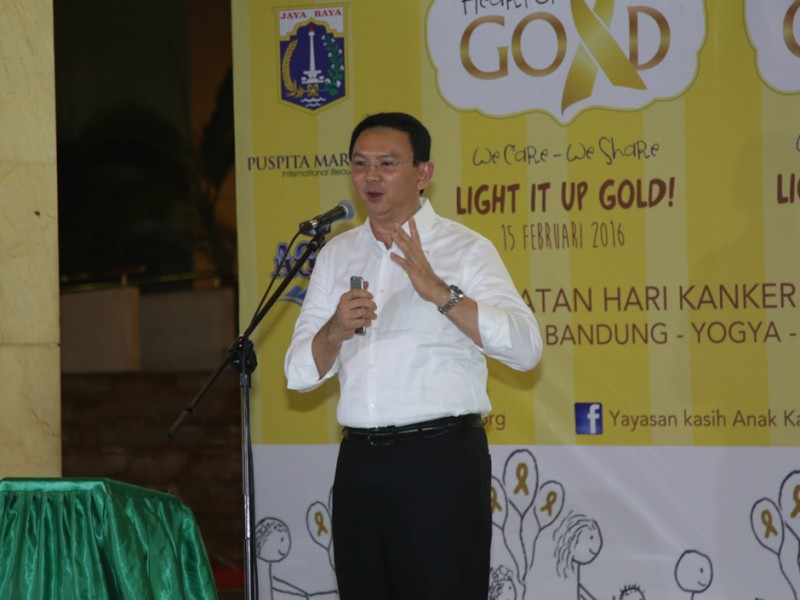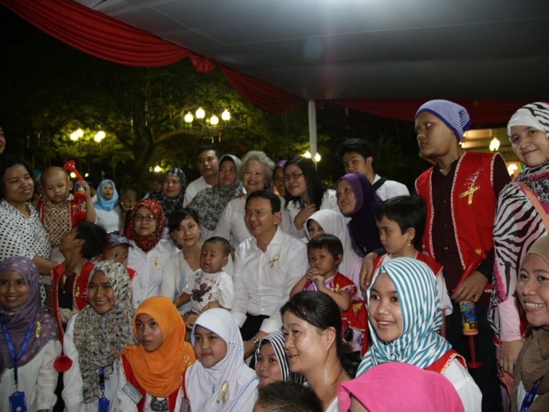 Gubernur DKI Jakarta, Basuki Tjahaja Purnama bersama puluhan anak penderita kanker memperingati Hari Kanker Anak Internasional yang jatuh pada tanggal 15 Februari, di halaman Balai Kota DKI Jakarta, Senin (15/02/2016). Peringatan Hari Kanker Anak Internasional 2016 ini ditandai dengan seremoni penyinaran landmark dengan lampu emas di Monumen Nasional (Monas), Patung Selamat Datang dan Tiang Flyover Antasari. Dalam kesempatan ini, penyinaran landmark lampu emas juga diikuti di 8 kota yakni, Jakarta, Bandung, Yogyakarta, Surabaya, Manado, Makassar, Pekanbaru dan Riau. (Foto: Yopie/beritajakarta.com)