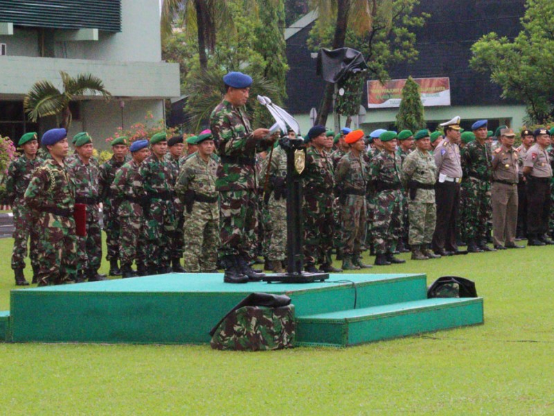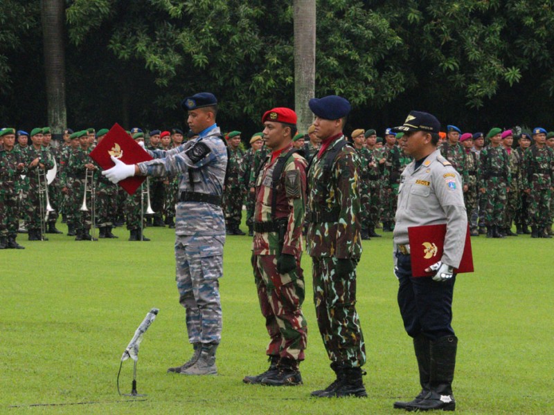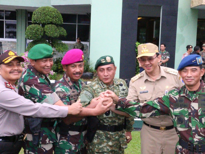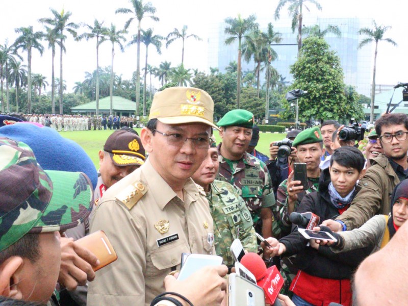 Gubernur DKI Jakarta, Basuki Tjahaja Purnama mengahadiri Apel Bersama 3 Pilar di Lapangan Makodam Jaya, Jl. Mayjen Sutoyo Cawang, Jakarta Timur Rabu (17/2/2016). Apel bersama ini sebagai pemantapan koordinasi dalam menghadapi banjir, Pengamanan Ibukota Jelang KTT OKI, serta pengamanan pe ertiban bangunan yang menempati tanah negara. (Foto: Faisal/Humas|Yopie/beritajakarta.com)