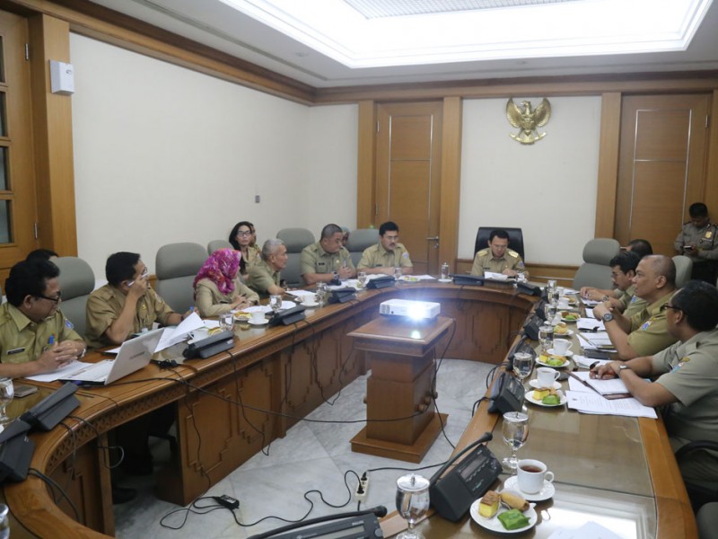 Gubernur DKI Jakarta, Basuki Tjahaja Purnama memimpin rapat terkait kebijakan tentang kantong plastik berbayar di Balai Kota DKI Jakarta, Selasa (23/2/). Dalam rapat ini hadir Asisten Bidang Pemerintahan Sekretaris Daerah Pemprov DKI Jakarta, Bambang Sugiyono, Kepala Badan Pengelola Lingkungan Hidup Daerah, Junaedi, dan Wakil Kepala Dinas Kebersihan DKI Jakarta, Ali Maulana Hakim,(Foto: Reza/beritajakarta.com)