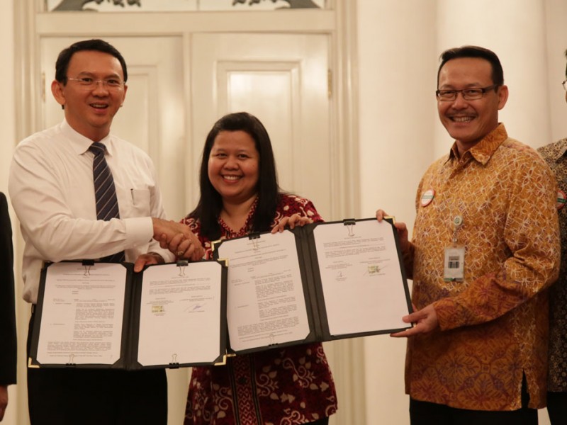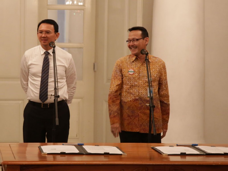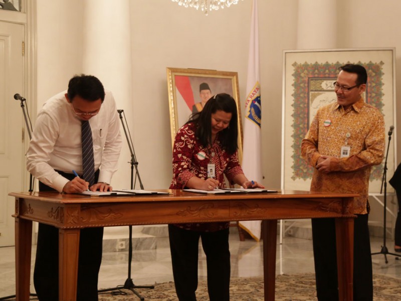Pemerintah Provinsi (Pemprov) DKI Jakarta bersama Badan Penyelenggara Jaminan Sosial (BPJS) Regional IV melakukan penandatanganan nota kesepahaman tentang optimalisasi jaminan kesehatan melalui integrasi sistem pelayanan terpadu satu pintu di Balai Kota DKI Jakarta Rabu (24/2/2016). Hal ini dilakukan untuk mempermudah akses pendaftaran peserta pekerja penerima upah (PPU).(Foto: Yopie/beritajakarta.com)
