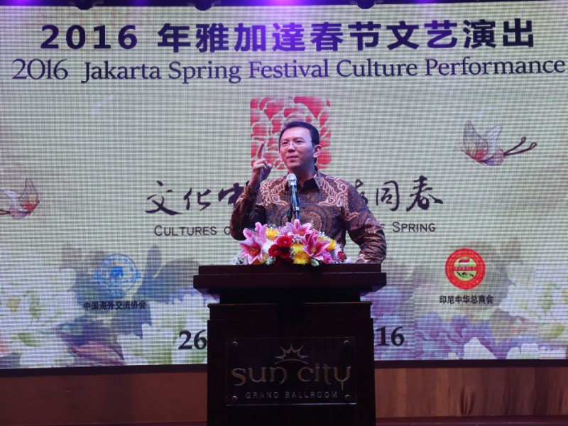 Gubernur DKI Jakarta, Basuki Tjahaja Purnama menghadiri acara The 2016 Jakarta Spring Festival Cultural Performance di Sun City Ballroom, Lindeteves Trade Centre, Jl. Hayam Wuruk, Jakarta Barat, Jumat (26/02/2016). Dalam acara ini hadir Presiden Ke-4 RI, Megawati Soekarno Putri, Ketua Perhimpunan Pengusaha Tionghoa Indonesia (Perpit), Kiki Bakri dan Duta besar Tiongkok untuk Indonesia, Xie Feng.(Foto: Reza/beritajakarta.com)