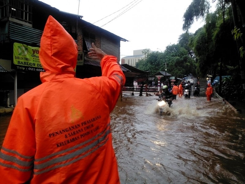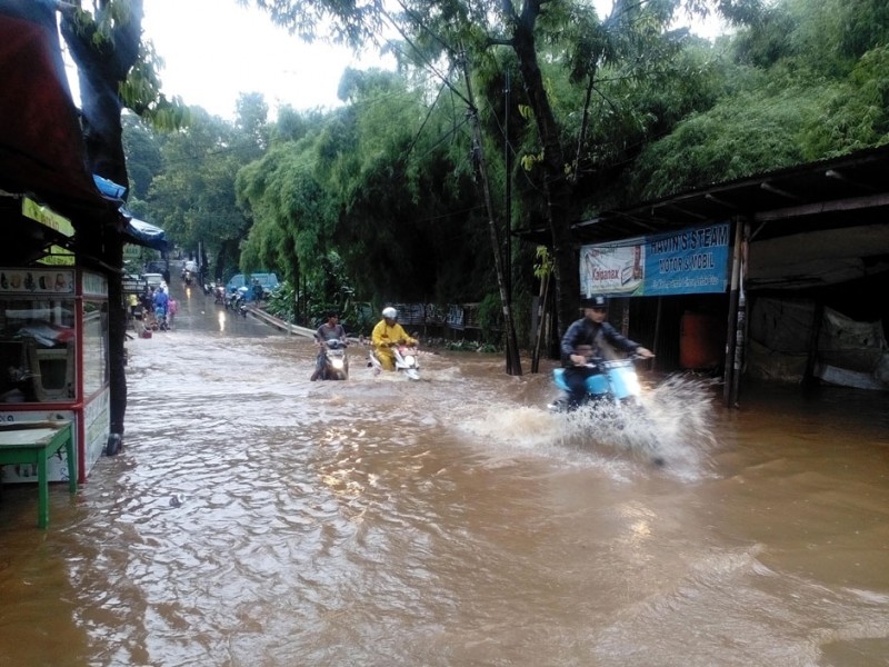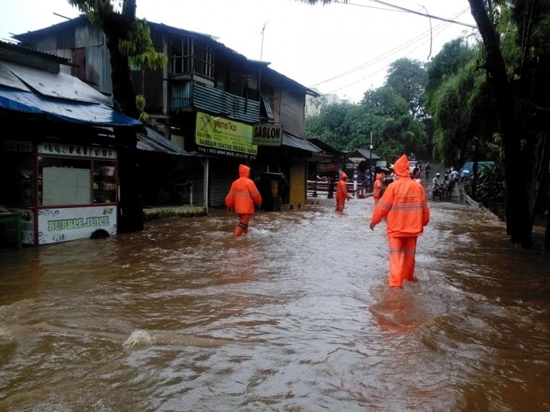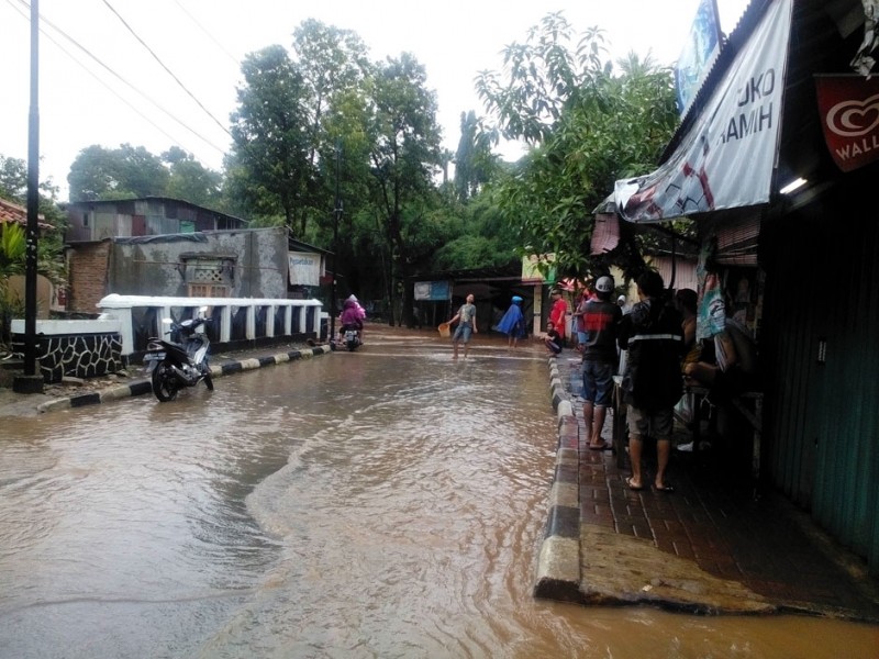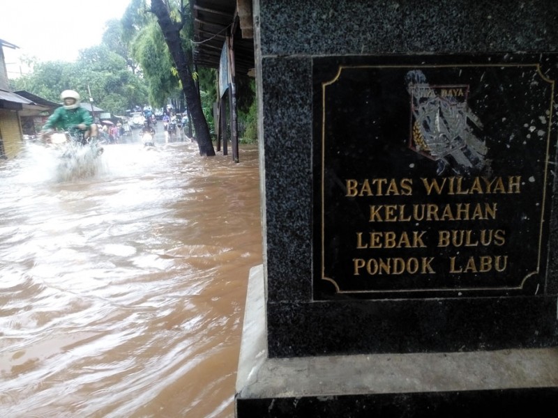 Hujan deras yang mengguyur wilayah Jakarta Selatan dan daerah hulu seperti Bogor Depok menyebabkan debit air di kali Grogol meningkat. Meningkatnya debit air membuat Jalan H Ipin tergenangan Minggu (28/2). (Foto: Agustinus Yossy/Beritajakarta.com)